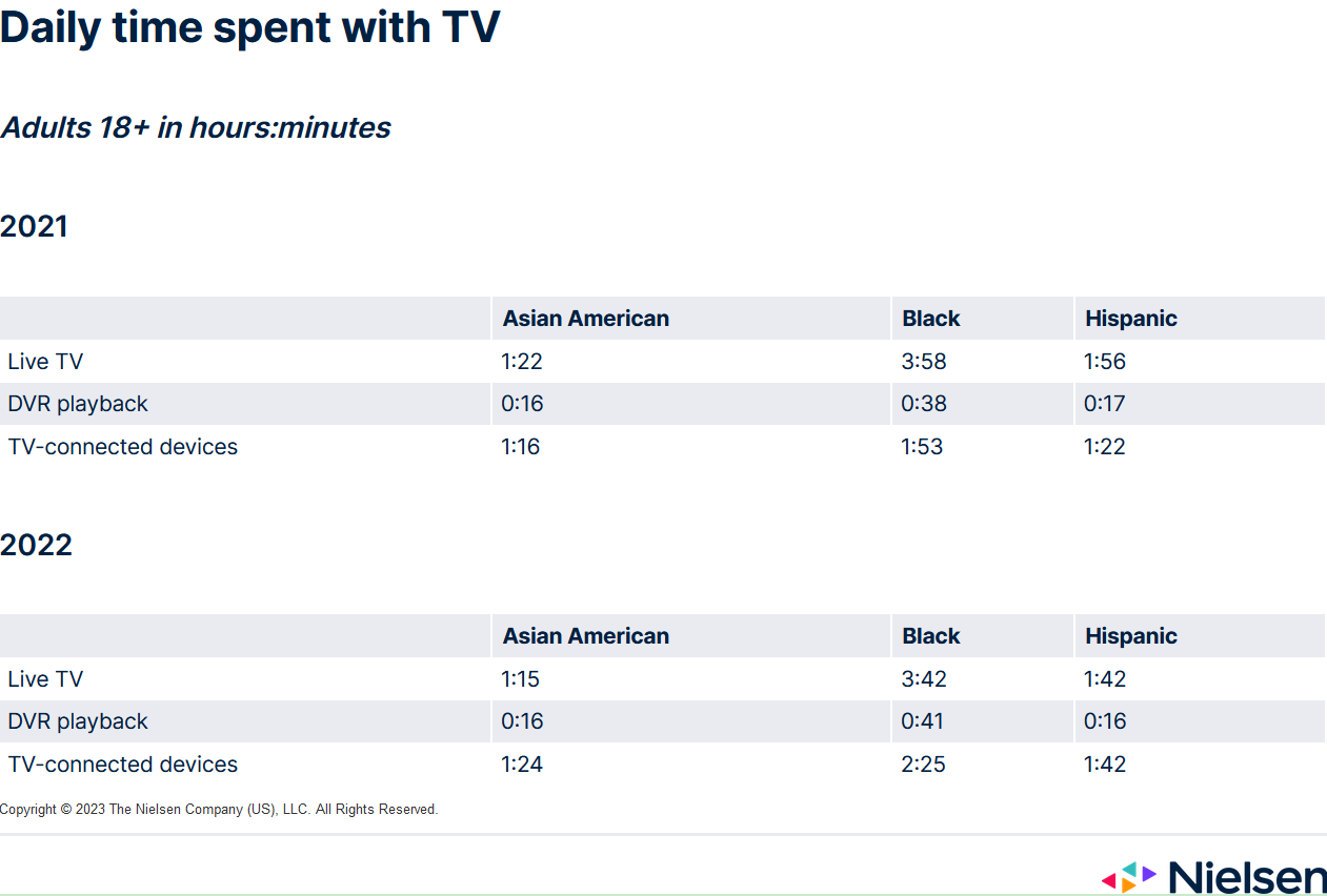 有趣的是,这种趋势在黑人观众中更为明显,他们花在直播时的观看时间明显多于其他群体。在西班牙裔和亚裔美国人中,时移观看的趋势与去年持平,但远低于普通人群。从整体看电视的角度来看,亚裔美国人花在看电视上的时间明显少于其他群体和普通人群。