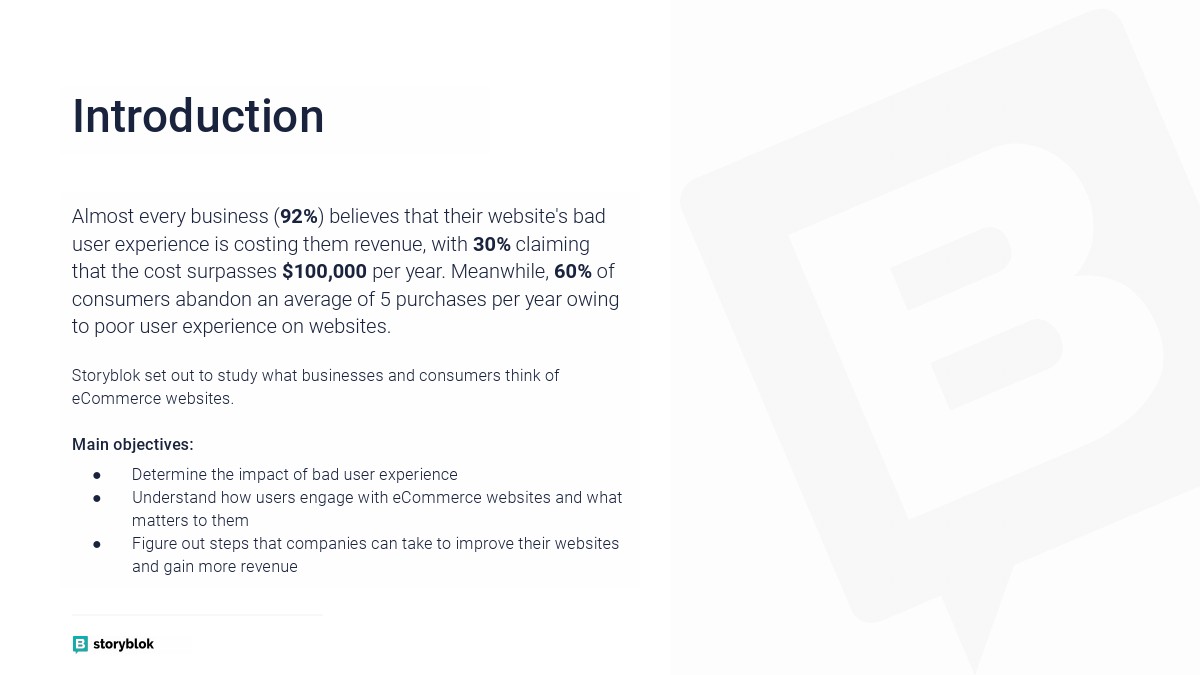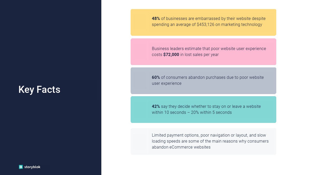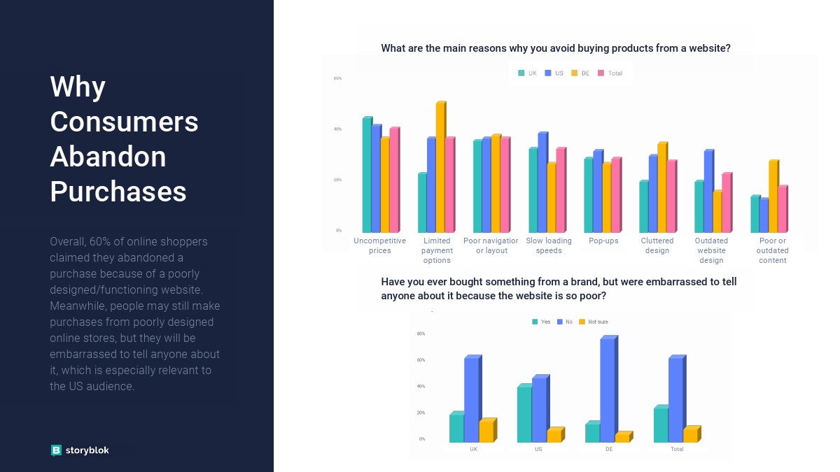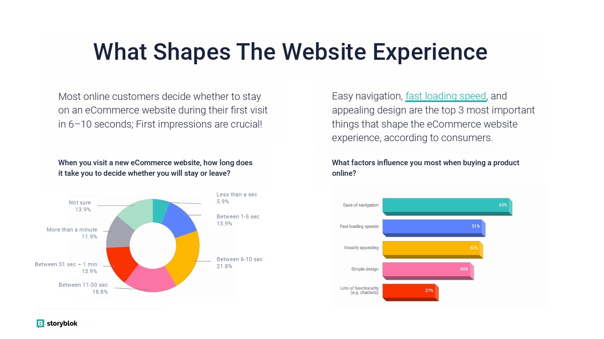 在对美国、英国和德国的6000名消费者进行调查后,Storyblok发现,约有1/5的消费者在访问一个新的电子商务网站时只需要5秒钟或更短的时间就能决定是留是走。其中有6%的人做出决定的时间不到一秒钟。