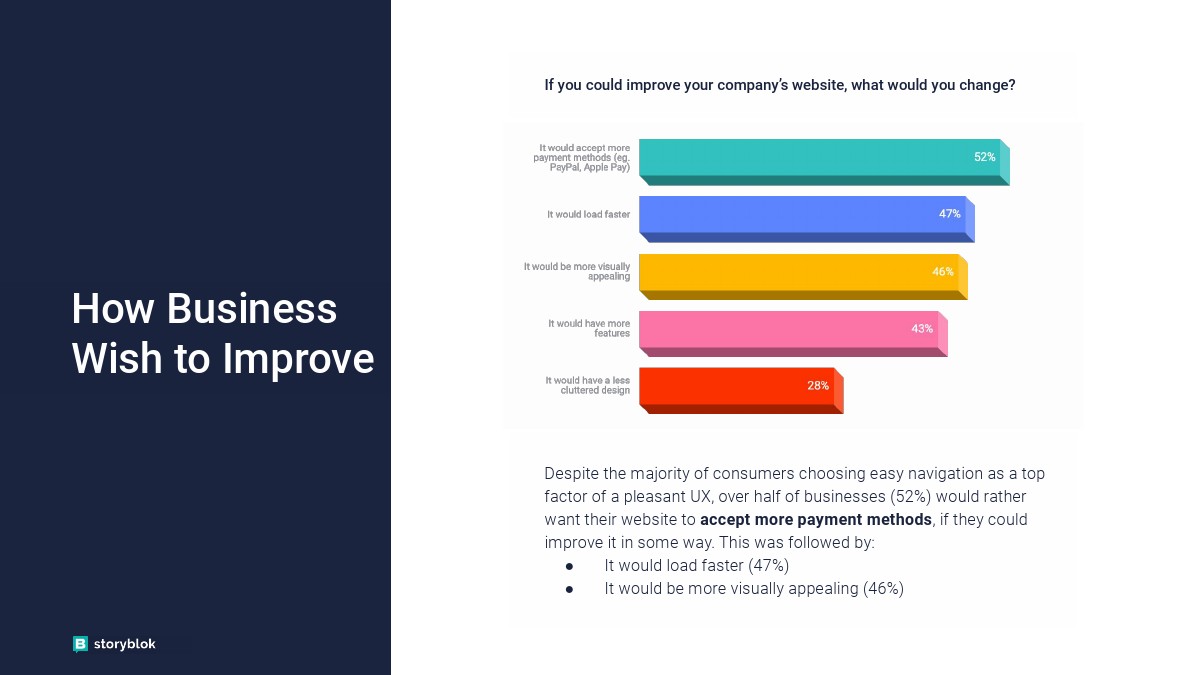在这项研究中,65%的受访者表示,在网上购买产品时影响受访者最大的因素是导航的便利性。快速决策,快速加载速度是关键,有一半的人(51%)认为这是他们购买过程中的一个决定因素。视觉吸引力(50%)和简单的设计(45%)也是影响因素。