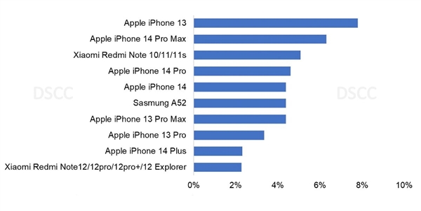 Display Supply Chain Consultants(DSCC)给出了2022年的全球最畅销手机,其中前10名OLED机型中有7款是iPhone。