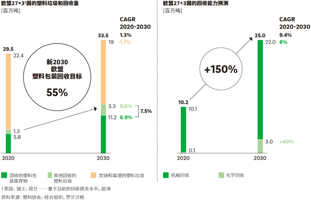 2020年,欧盟地区24%的塑料垃圾被回收利用,其余的塑料垃圾被填埋或焚烧。就塑料包装而言,回收的比率更高,为30%,因为欧盟目前几乎所有的塑料法规都集中在包装方面。然而,30%的回收比例与2018年出台的《包装和包装废弃物指令》中设定的目标仍有很大差距。目标规定到2025年回收比例达到50%,到2030年达到55%(图2)。