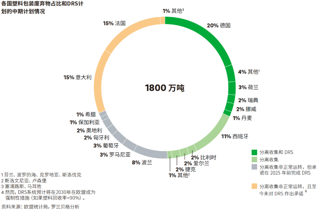 图4: 欧盟各国塑料包装废弃物占比和DRS计划的中期计划情况