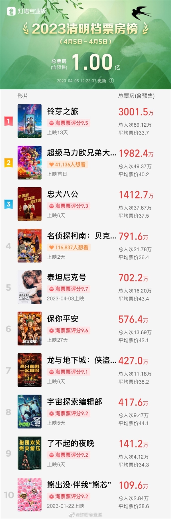 据灯塔专业版实时数据,截至4月5日12时23分,2023年清明档(4月5日)总票房突破1亿元。