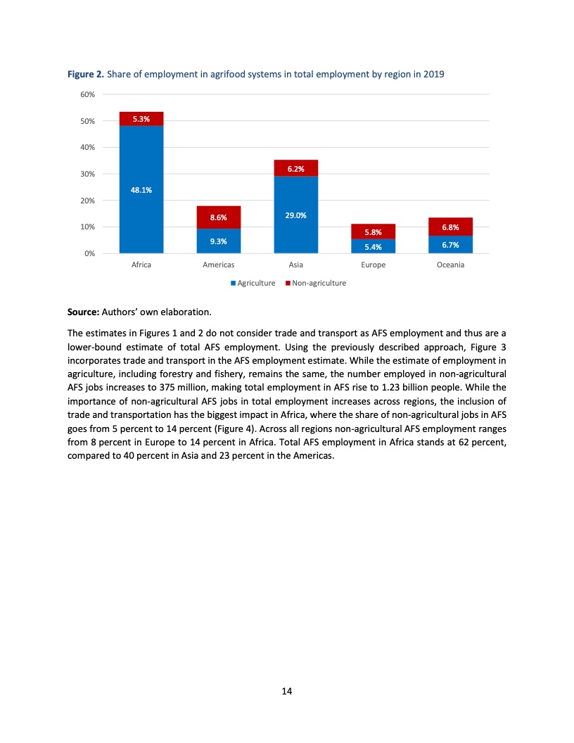 非农岗位在农业粮食体系就业中的占比从欧洲到非洲分别为8%到14%不等。