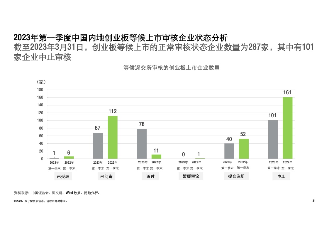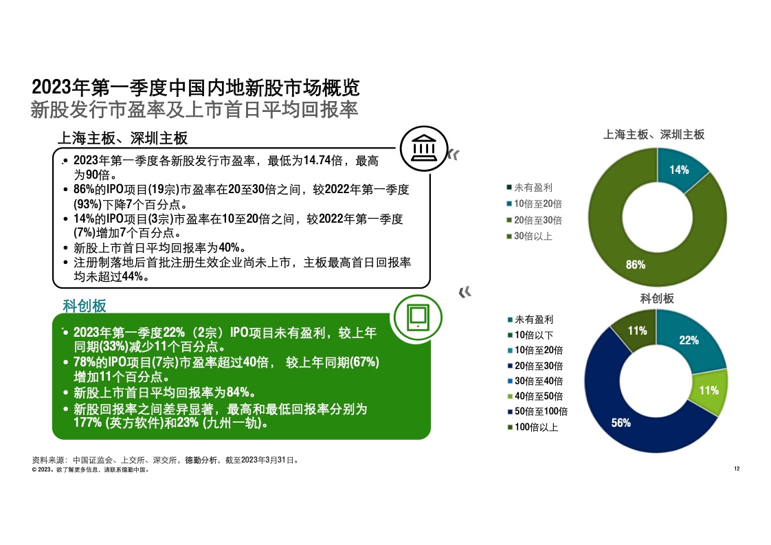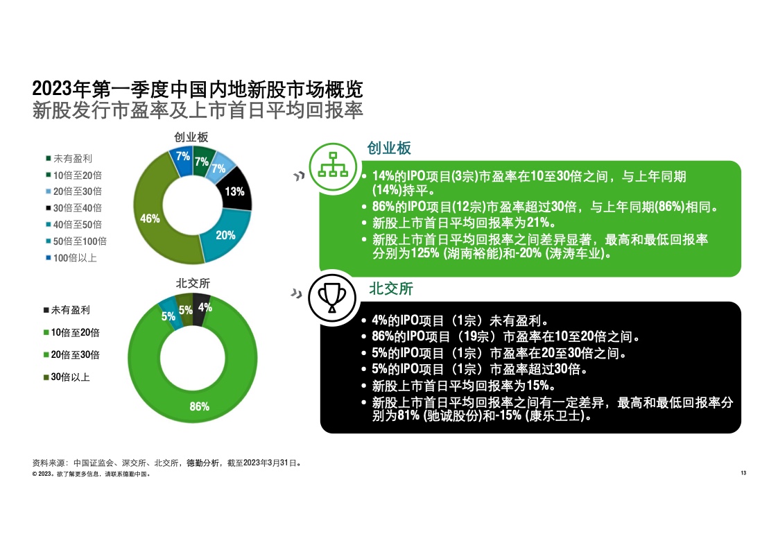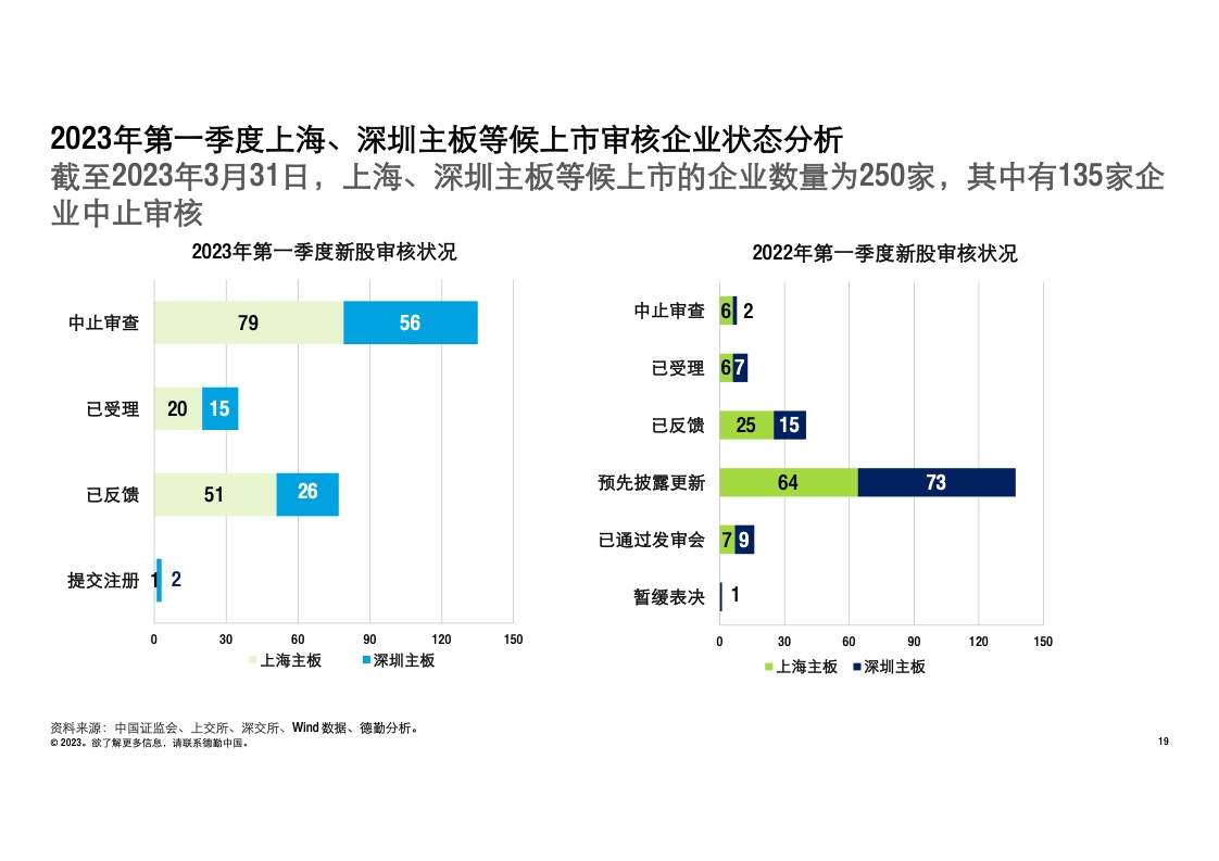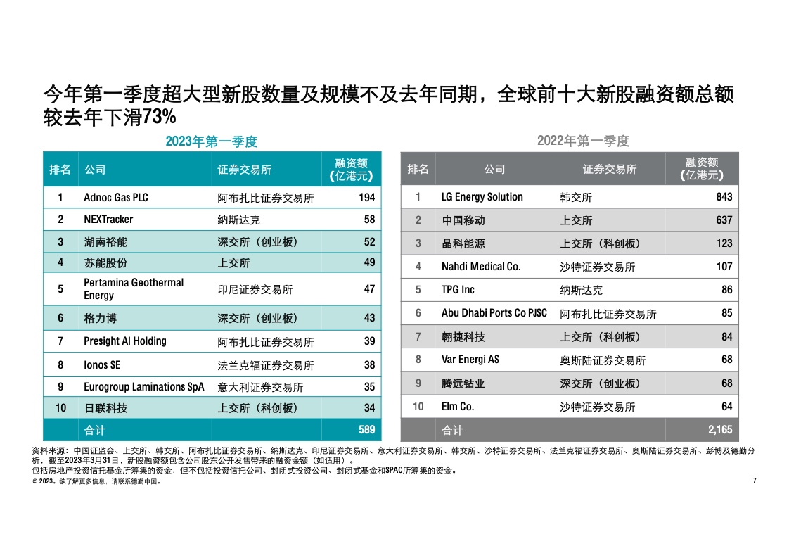 报告中,德勤中国资本市场服务部指出,以2023年首季的融资总额计算,在季内完成两宗全球十大新股后,深圳证券交易所(“深交所”)及上海证券交易所(“上交所”)分别成为全球最大与第二大的上市目的地。阿布扎比证券交易所则以完成一家天然气公司上市夺得第三位,该宗上市同时为全球最大新股。纳斯达克及香港交易所分别取得第四位及第五位。