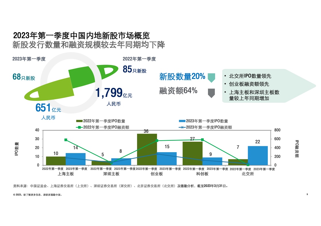 截至2023年3月31日,A股市场有68只新股融资651亿元人民币,相较2022年首季,市场有85只新股发行上市融资额达1,799亿元人民币, 新股数量下跌20%,而新股融资额下滑64%。北交所的新股数量大幅增加,并获得最多的新股数量,而创业板的融资金额则为最多。