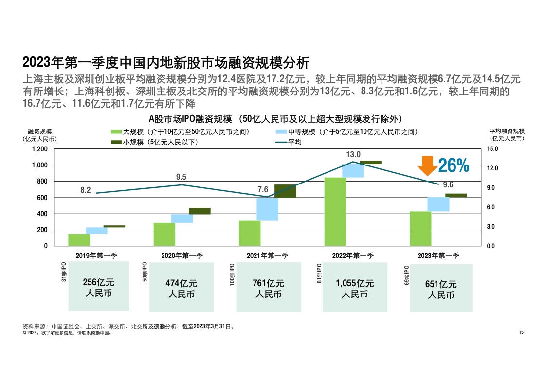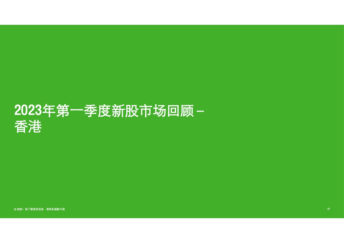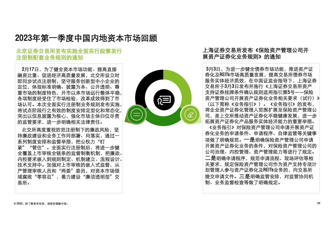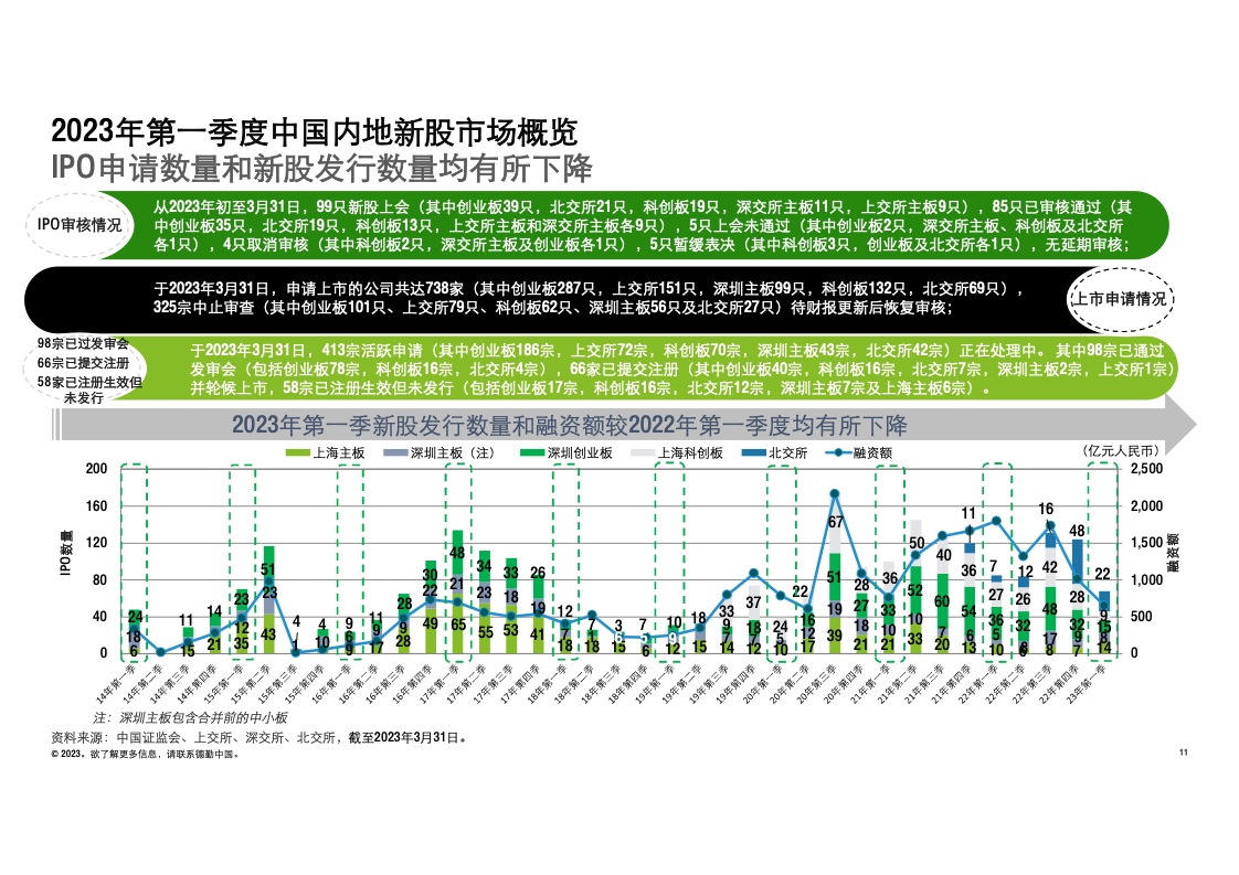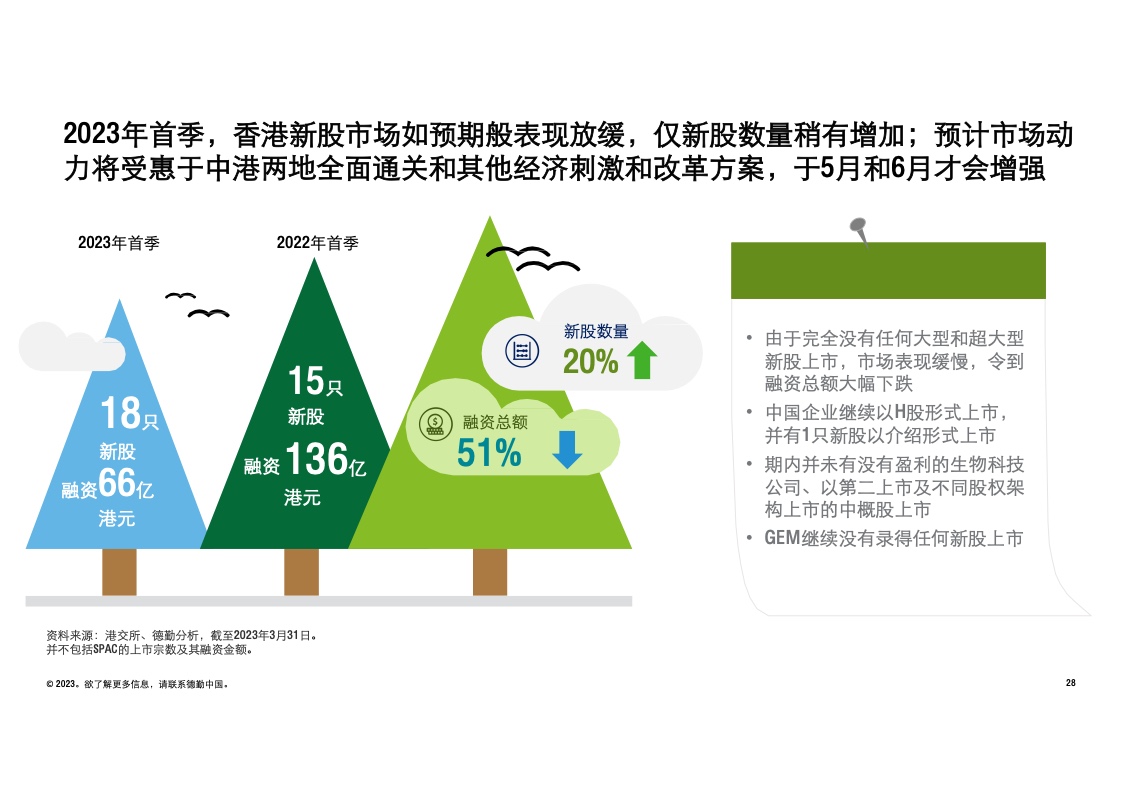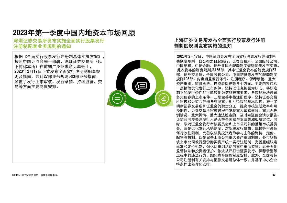 资本市场服务部预期,全面实行股票发行注册制后,内地新股活动将于后三季逐趋活跃。在经济及商业活动逐渐恢复、中央政府稳经济增长的政策及措施以及新股常态化发行的支持下,预计A股市场在2023年仍然会获得较2022年多的新股融资额,而2022年为A股市场新股融资额刷下新纪录的一年。