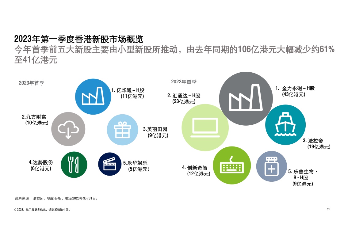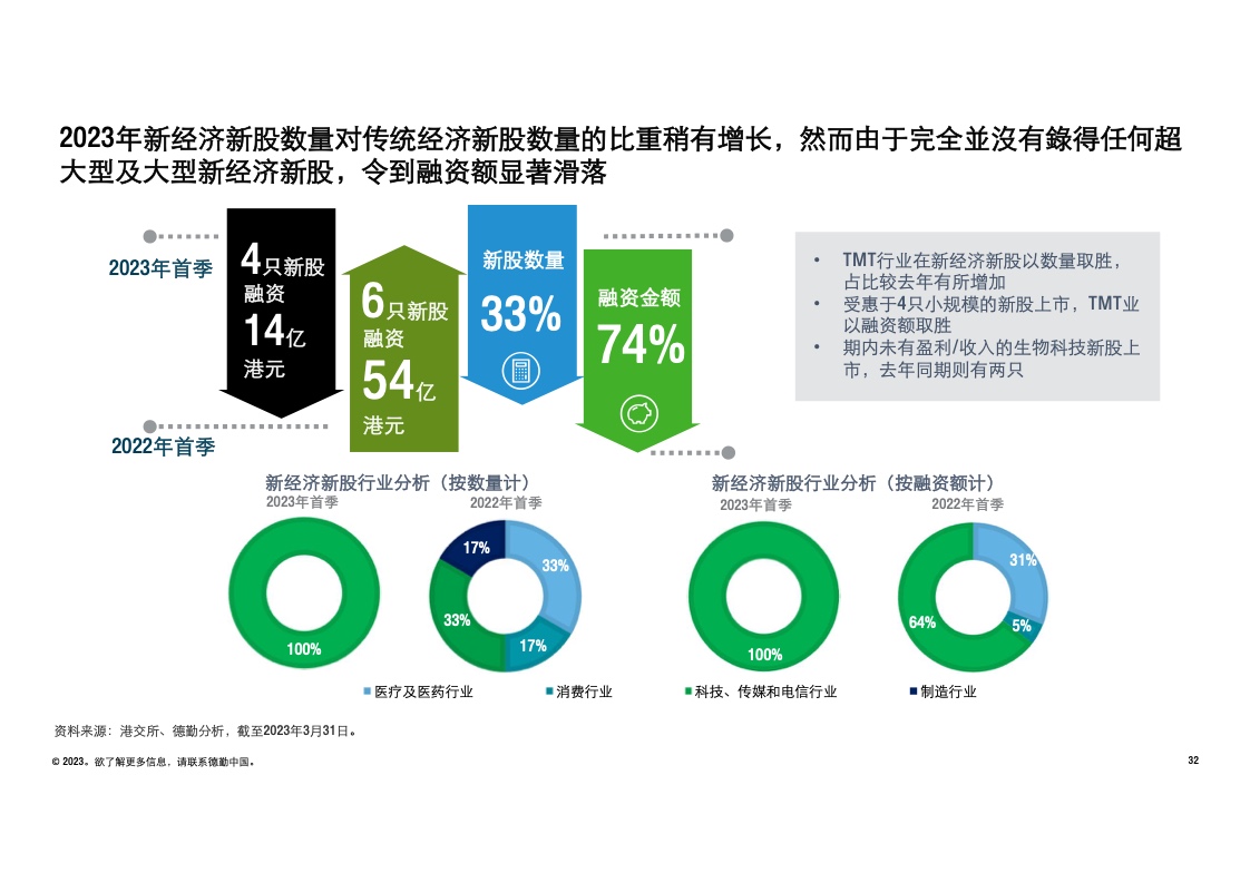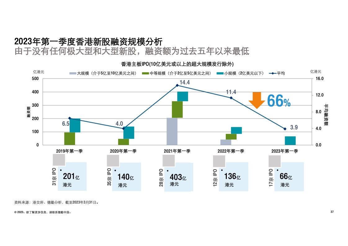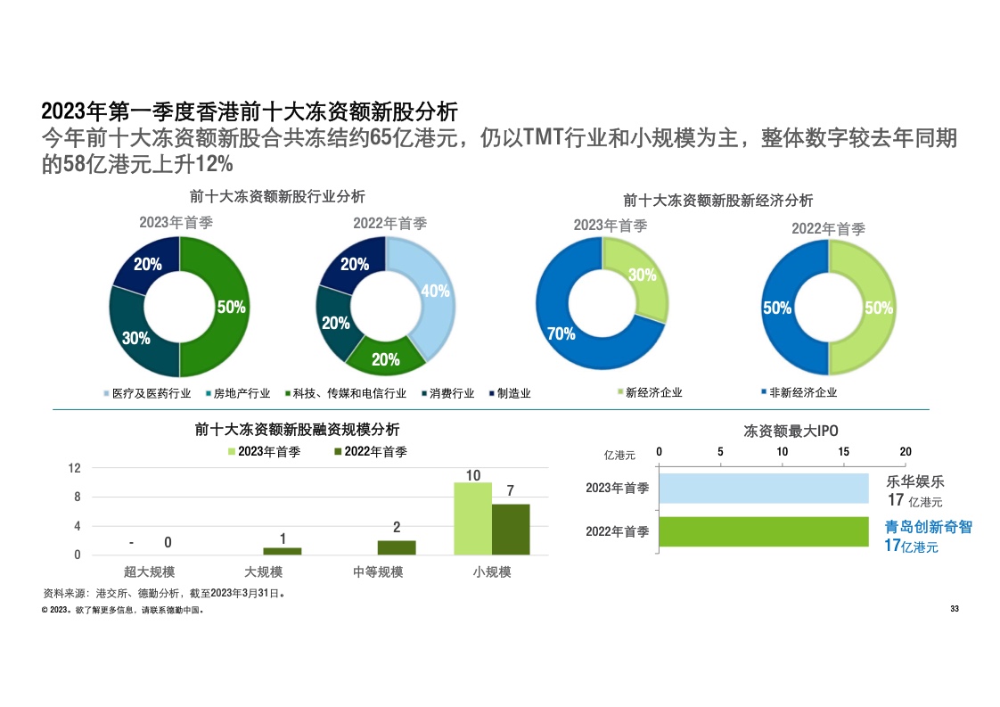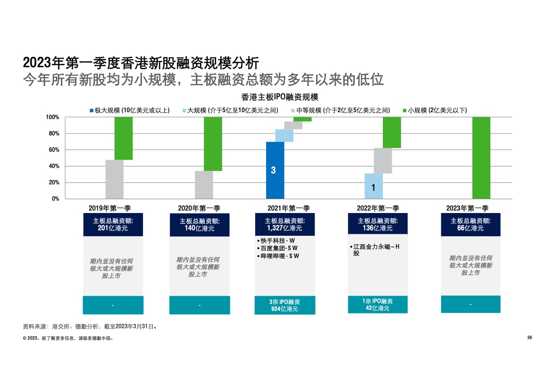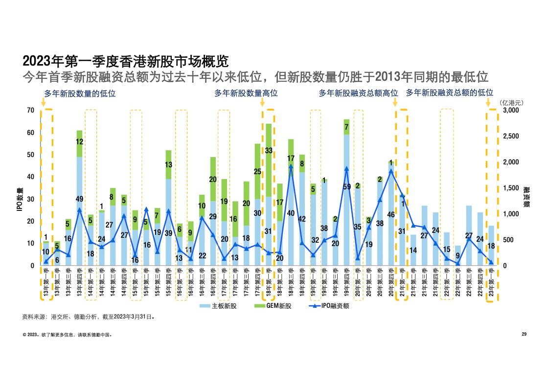 2023年第一季,香港新股市场表现放缓,有18只新股上市融资66亿港元,相较2022年首季为15只新股融资136亿港元,新股数量增加20%,而融资额下滑51%。在2023年首季,所有新股的融资规模都属于小型,并且没有任何中概股回归及医疗及医药公司上市。