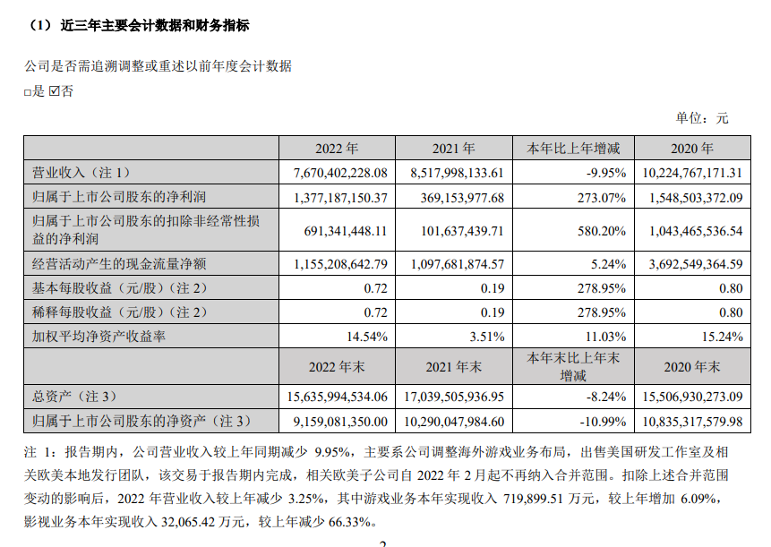 扣除上述合并范围变动的影响后,2022 年营业收入较上年同期减少 3.25%,其中游戏业务本年实现收入 71.99 亿元,较上年同期上升 6.09%,影视业务本年实现收入 3.2 亿元,较 上年同期减少 66.33%。