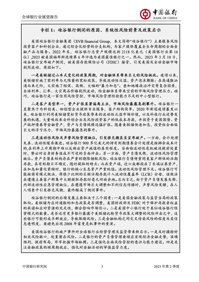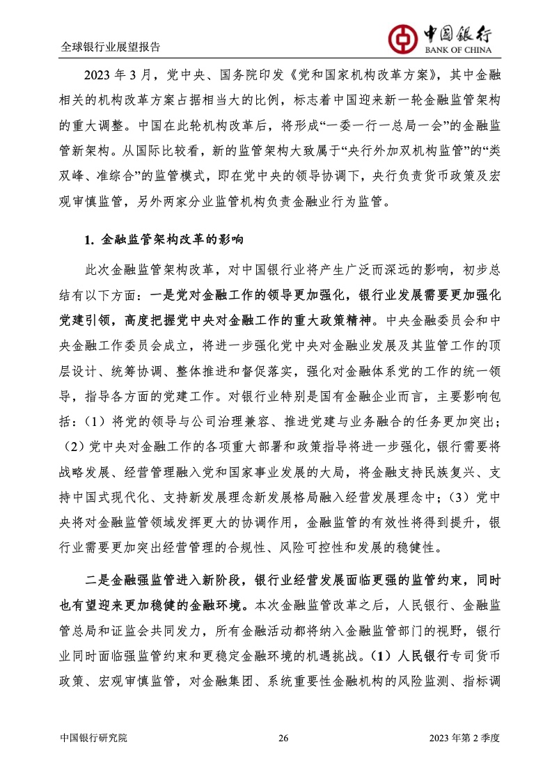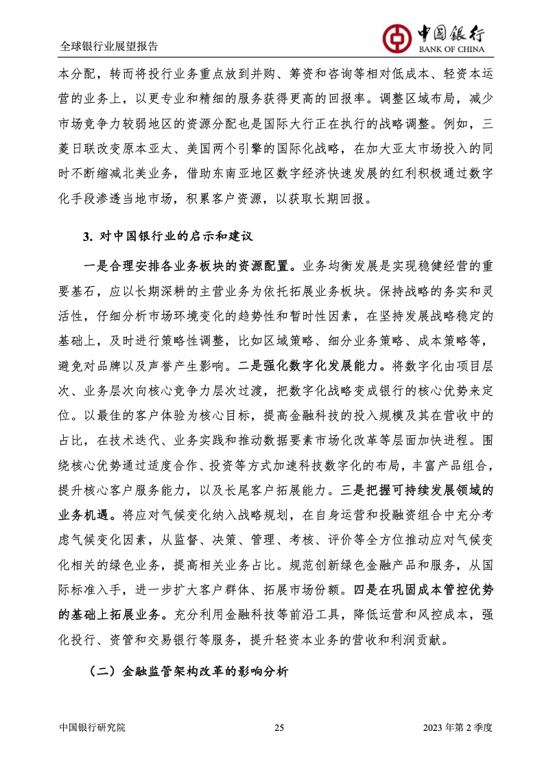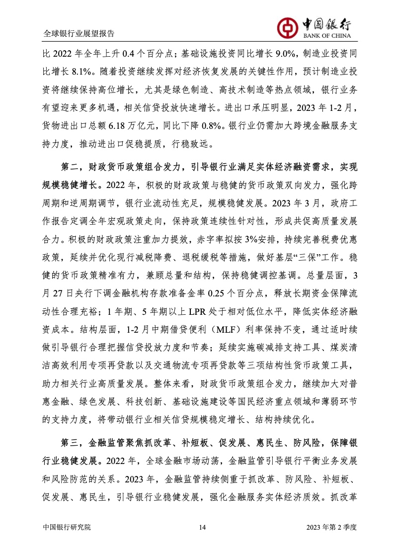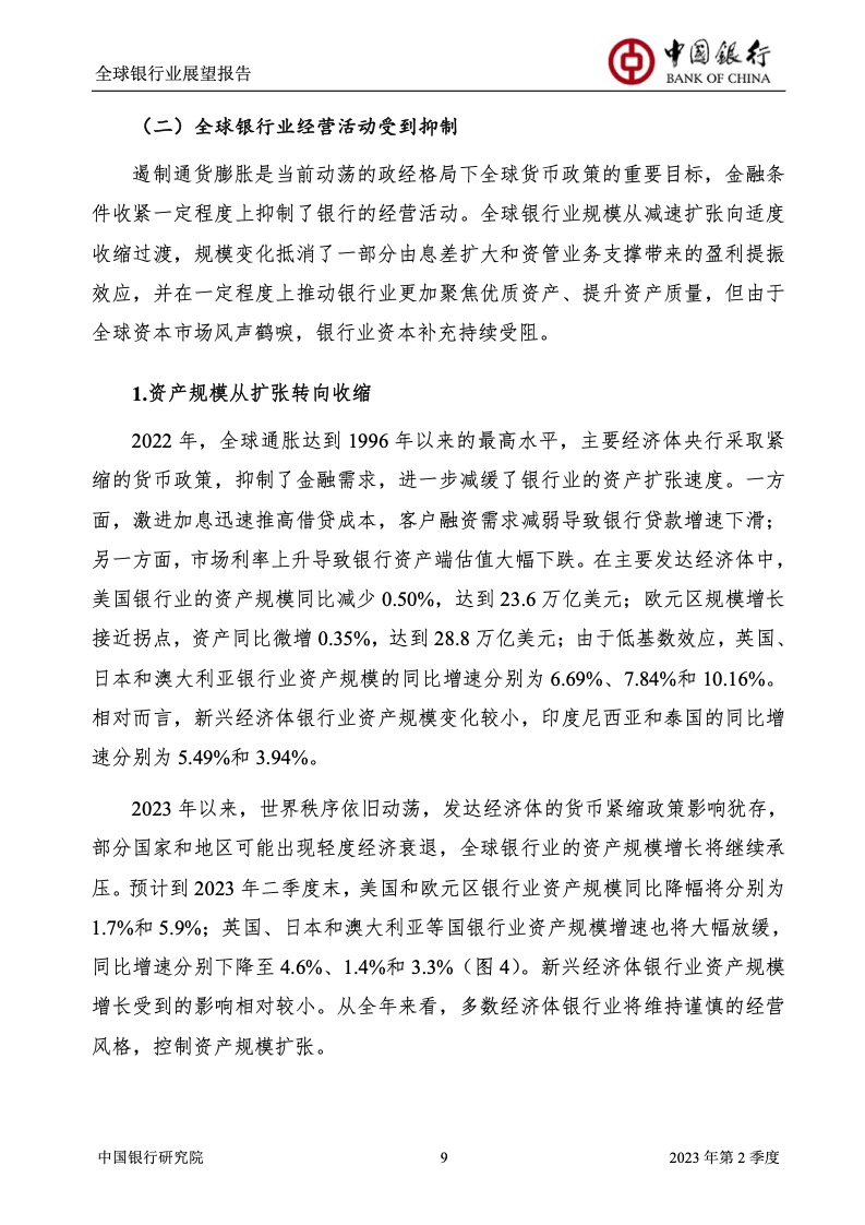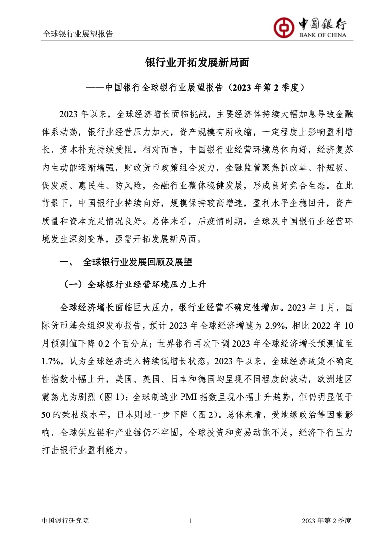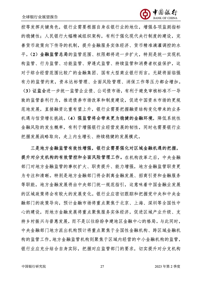 中国银行研究院:2023年第2季度全球银行业展望报告 关于全球银行业发展形势,《报告》认为,2023年以来,全球经济面临众多挑战,主要经济体持续大幅加息导致金融体系动荡,银行业经营压力加大,资产规模有所收缩,一定程度上影响盈利增长,资本补充持续受阻。 相对而言,中国银行业经营环境总体向好,经济复苏动能逐渐增强,财政货币政策组合发力,金融监管聚焦抓改革、补短板、促发展、惠民生、防风险,金融行业整体稳健发展,形成良好竞合生态。 在此背景下,中国银行业经营持续向好,规模保持较高增速,盈利水平企稳回升,资产质量和资本充足情况良好。 更多阅读:中国银行研究院:2025年第二季度全球银行业展望报告中国银行研究院:2025年第三季度全球银行业展望报告中国银行:全球银行业展望报告(2025年)中国银行:2022年第3季度全球银行业展望报告中国银行研究院:2020年中国银行全球经济金融展望报告中国银行研究院:2024年第三季度全球银行业展望报告中国银行研究院:2024年第三季度全球经济金融展望报告中国银行研究院:2025年第三季度全球经济金融展望报告中国银行研究院:2025年第2季度全球经济金融展望报告中国银行研究院:2023年第2季度中国经济金融展望报告中国银行研究院:2022年第3季度中国经济金融展望报告中国银行研究院:2024年第2期中国区域经济金融展望报告中国银行研究院:2025年第三季度中国经济金融展望报告中国银行研究院:2025年第二季度中国经济金融展望报告中国银行研究院:2024年第3季度中国经济金融展望报告