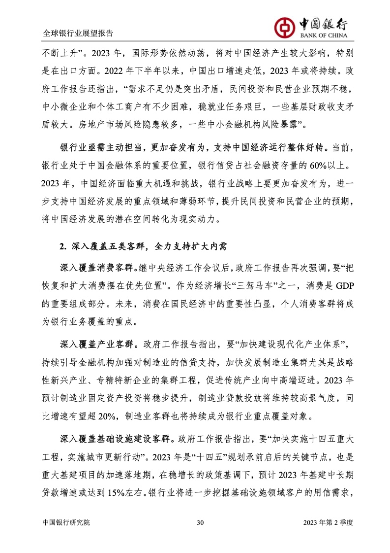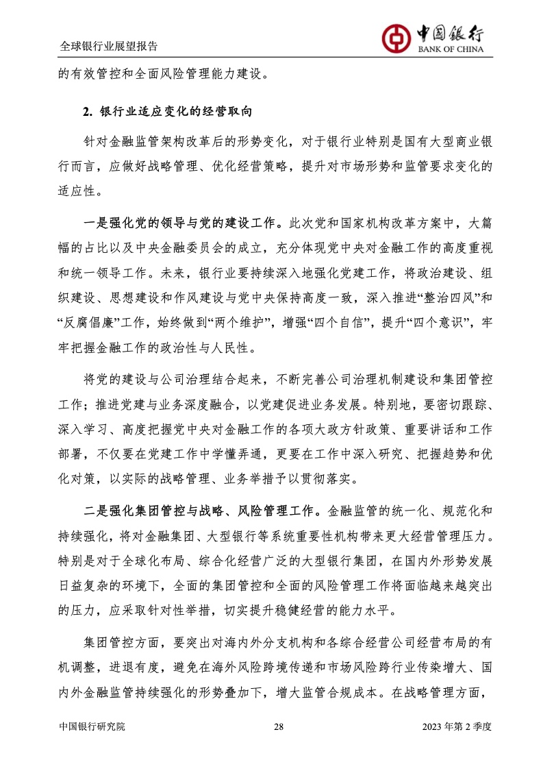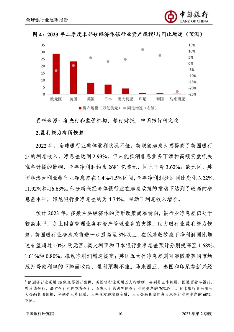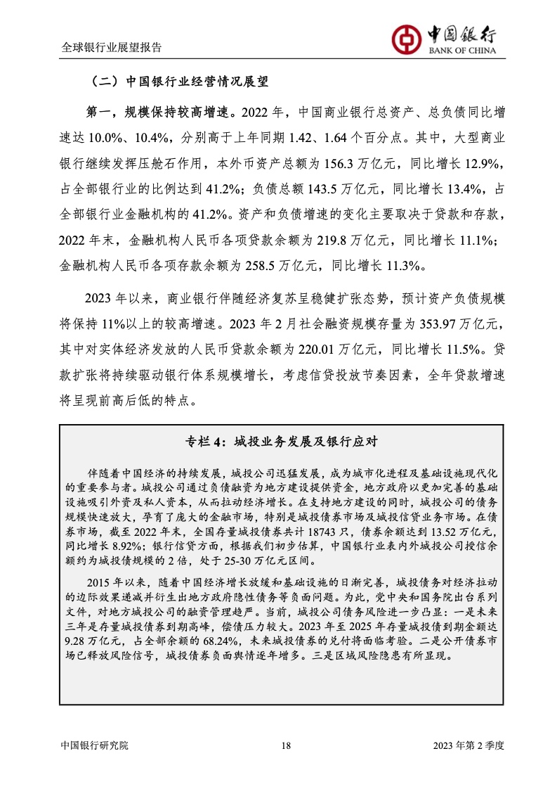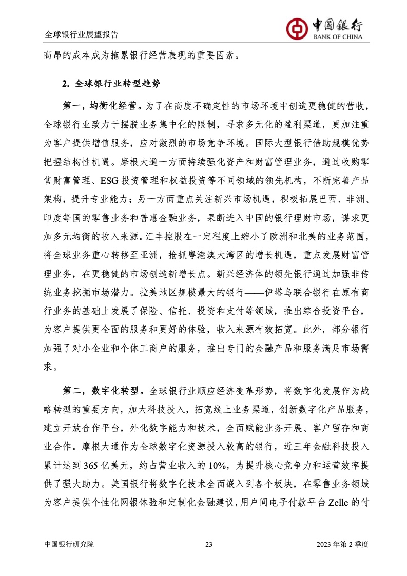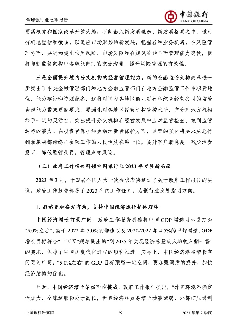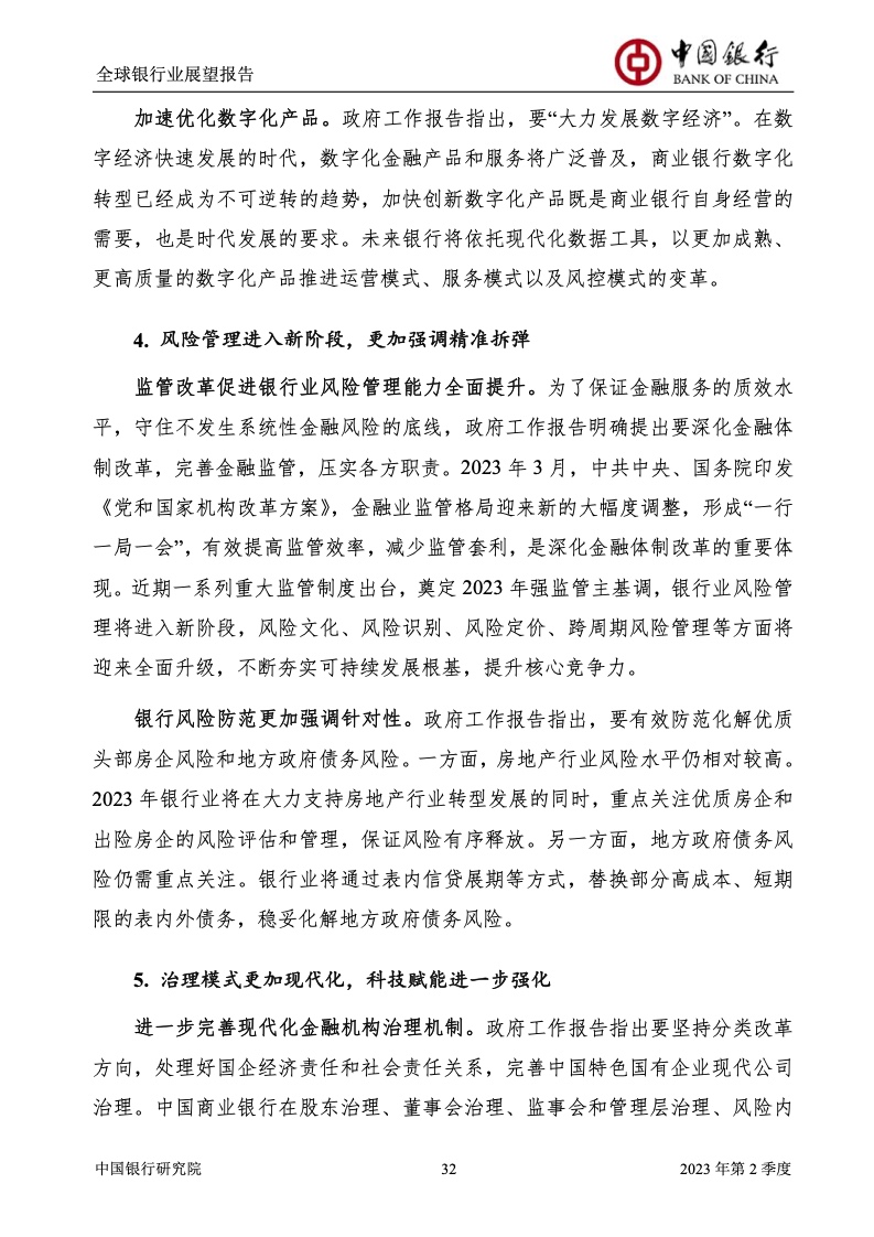 中国银行研究院:2023年第2季度全球银行业展望报告 关于全球银行业发展形势,《报告》认为,2023年以来,全球经济面临众多挑战,主要经济体持续大幅加息导致金融体系动荡,银行业经营压力加大,资产规模有所收缩,一定程度上影响盈利增长,资本补充持续受阻。 相对而言,中国银行业经营环境总体向好,经济复苏动能逐渐增强,财政货币政策组合发力,金融监管聚焦抓改革、补短板、促发展、惠民生、防风险,金融行业整体稳健发展,形成良好竞合生态。 在此背景下,中国银行业经营持续向好,规模保持较高增速,盈利水平企稳回升,资产质量和资本充足情况良好。 更多阅读:中国银行研究院:2025年第二季度全球银行业展望报告中国银行研究院:2025年第三季度全球银行业展望报告中国银行:全球银行业展望报告(2025年)中国银行:2022年第3季度全球银行业展望报告中国银行研究院:2020年中国银行全球经济金融展望报告中国银行研究院:2024年第三季度全球银行业展望报告中国银行研究院:2024年第三季度全球经济金融展望报告中国银行研究院:2025年第三季度全球经济金融展望报告中国银行研究院:2025年第2季度全球经济金融展望报告中国银行研究院:2023年第2季度中国经济金融展望报告中国银行研究院:2022年第3季度中国经济金融展望报告中国银行研究院:2024年第2期中国区域经济金融展望报告中国银行研究院:2025年第三季度中国经济金融展望报告中国银行研究院:2025年第二季度中国经济金融展望报告中国银行研究院:2024年第3季度中国经济金融展望报告