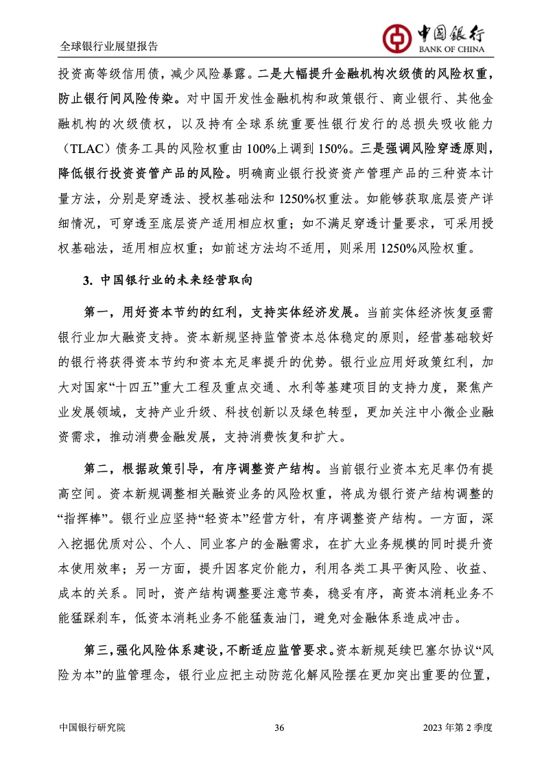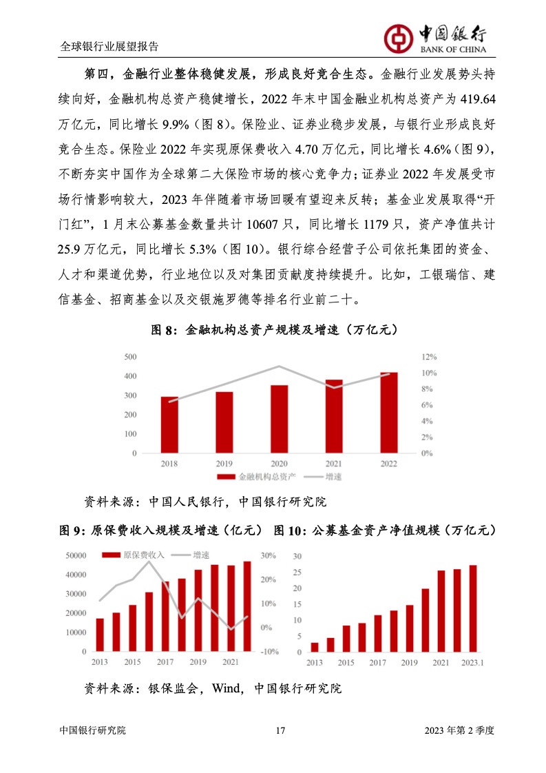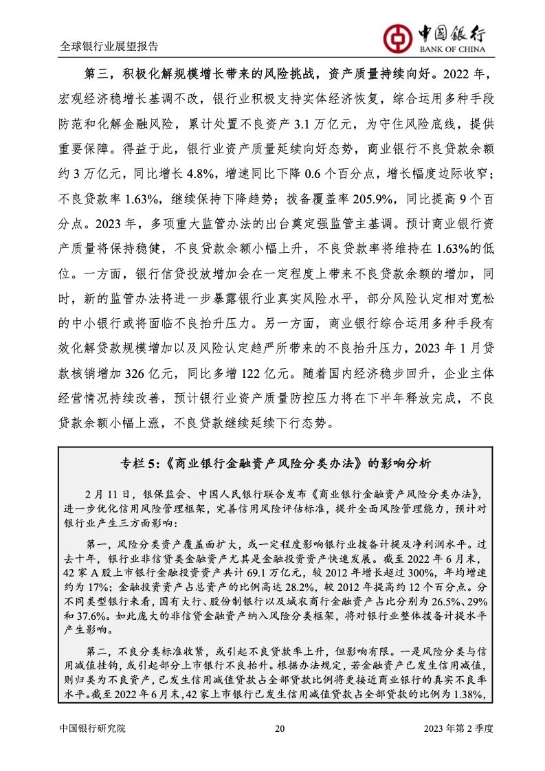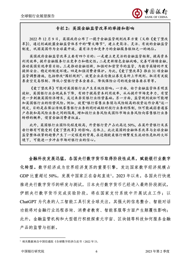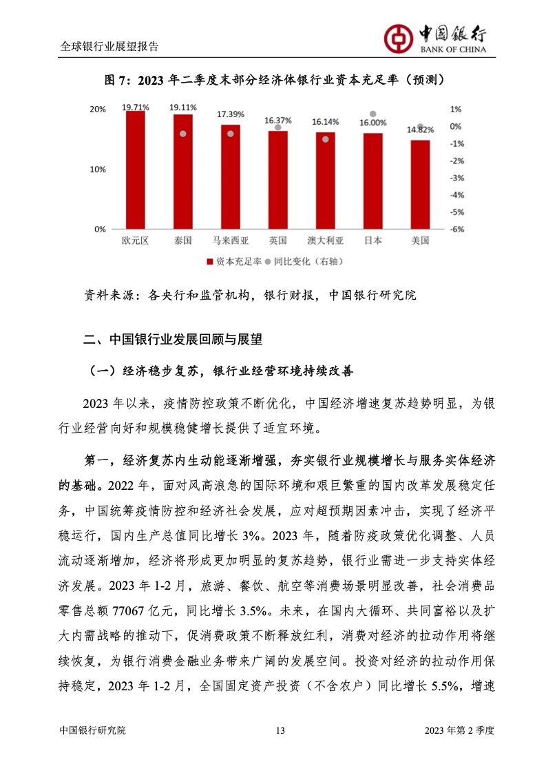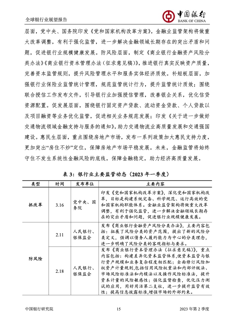 中国银行研究院:2023年第2季度全球银行业展望报告 关于全球银行业发展形势,《报告》认为,2023年以来,全球经济面临众多挑战,主要经济体持续大幅加息导致金融体系动荡,银行业经营压力加大,资产规模有所收缩,一定程度上影响盈利增长,资本补充持续受阻。 相对而言,中国银行业经营环境总体向好,经济复苏动能逐渐增强,财政货币政策组合发力,金融监管聚焦抓改革、补短板、促发展、惠民生、防风险,金融行业整体稳健发展,形成良好竞合生态。 在此背景下,中国银行业经营持续向好,规模保持较高增速,盈利水平企稳回升,资产质量和资本充足情况良好。 更多阅读:中国银行研究院:2025年第二季度全球银行业展望报告中国银行研究院:2025年第三季度全球银行业展望报告中国银行:全球银行业展望报告(2025年)中国银行:2022年第3季度全球银行业展望报告中国银行研究院:2020年中国银行全球经济金融展望报告中国银行研究院:2024年第三季度全球银行业展望报告中国银行研究院:2024年第三季度全球经济金融展望报告中国银行研究院:2025年第三季度全球经济金融展望报告中国银行研究院:2025年第2季度全球经济金融展望报告中国银行研究院:2023年第2季度中国经济金融展望报告中国银行研究院:2022年第3季度中国经济金融展望报告中国银行研究院:2024年第2期中国区域经济金融展望报告中国银行研究院:2025年第三季度中国经济金融展望报告中国银行研究院:2025年第二季度中国经济金融展望报告中国银行研究院:2024年第3季度中国经济金融展望报告