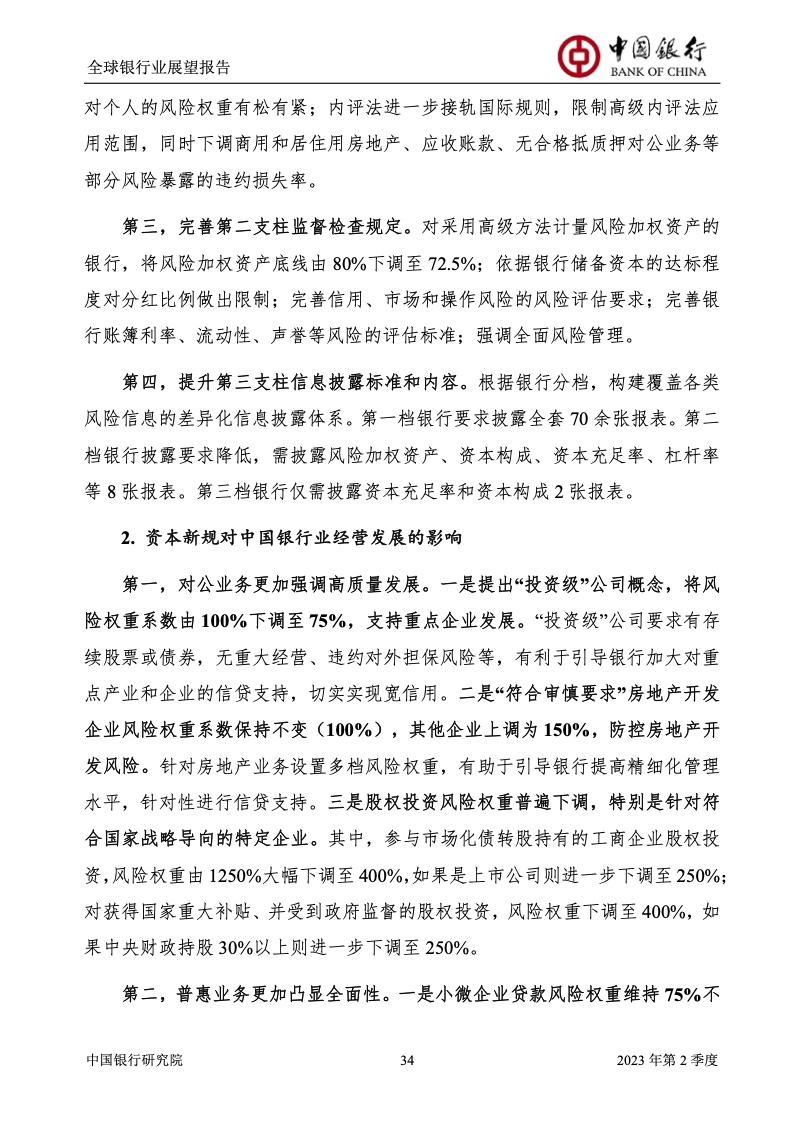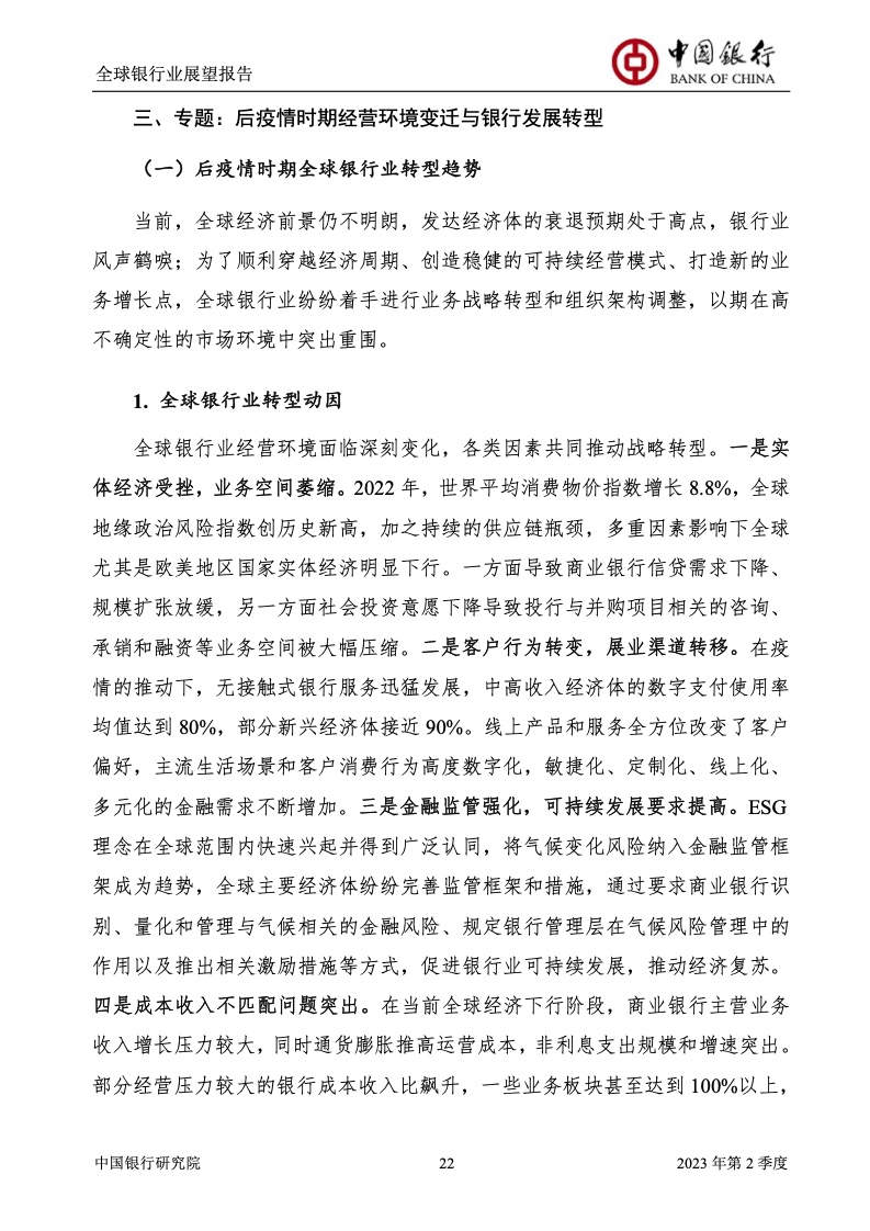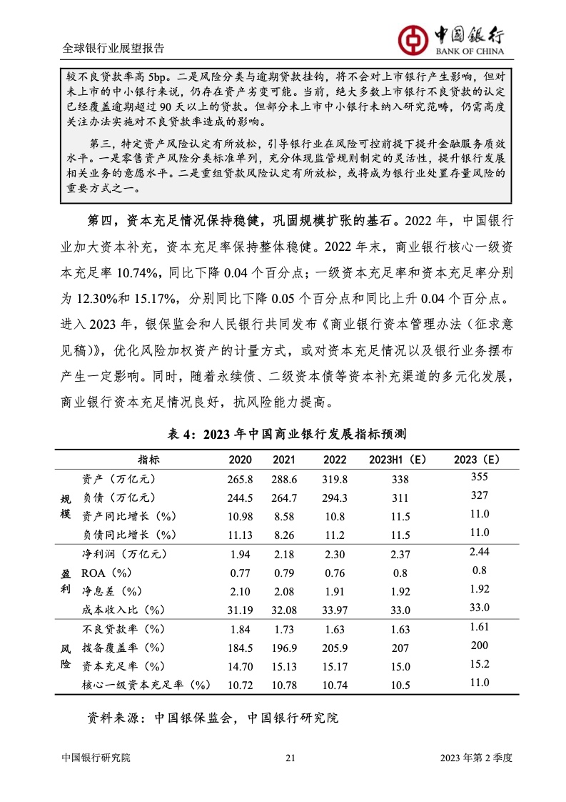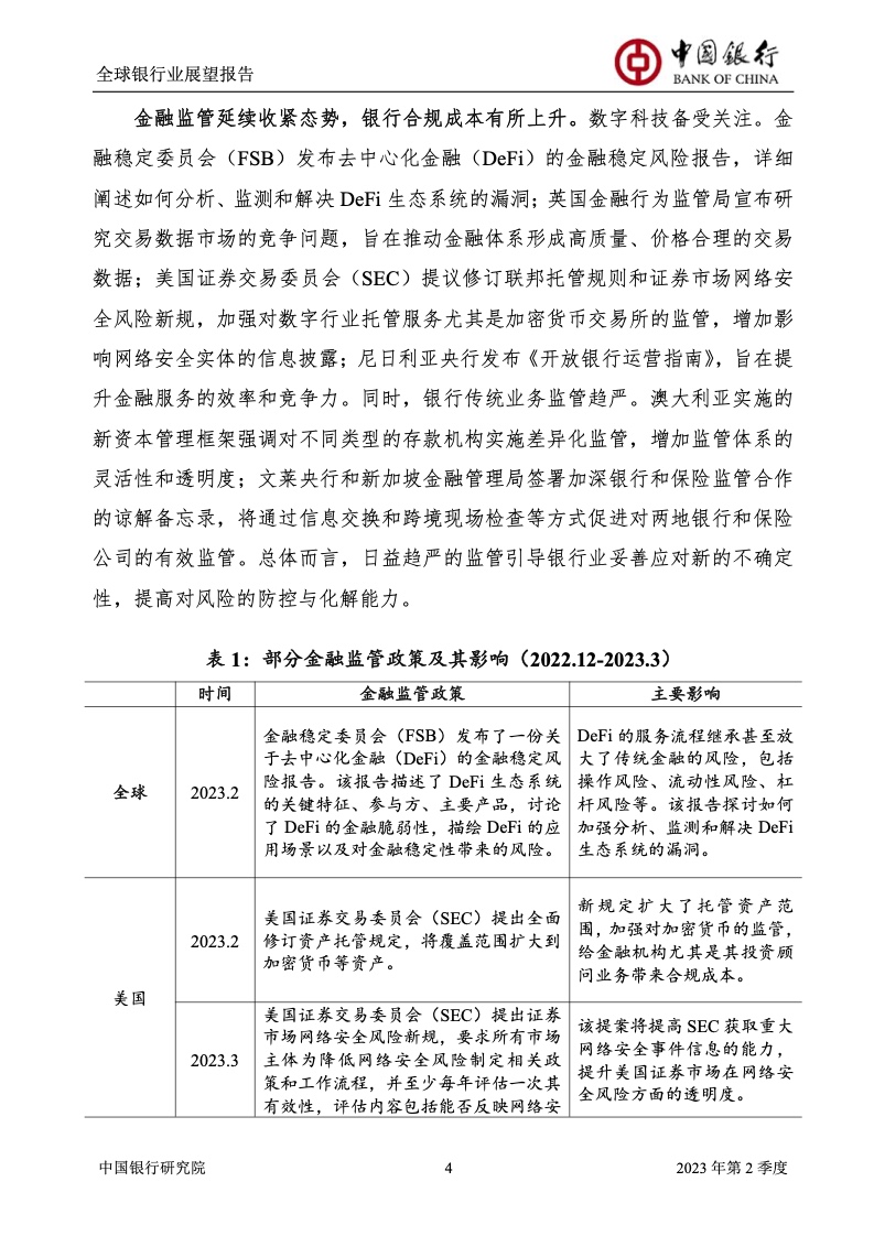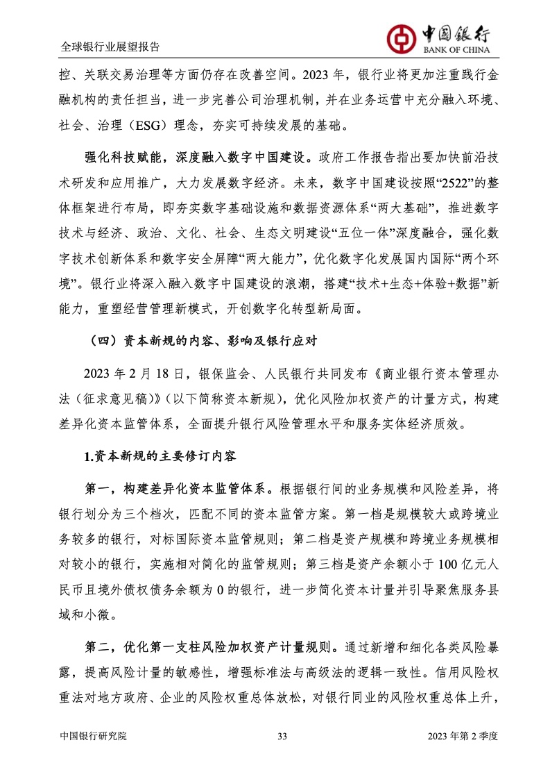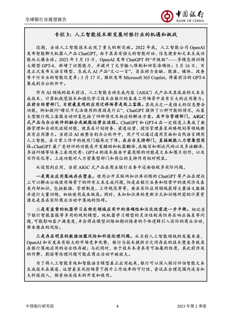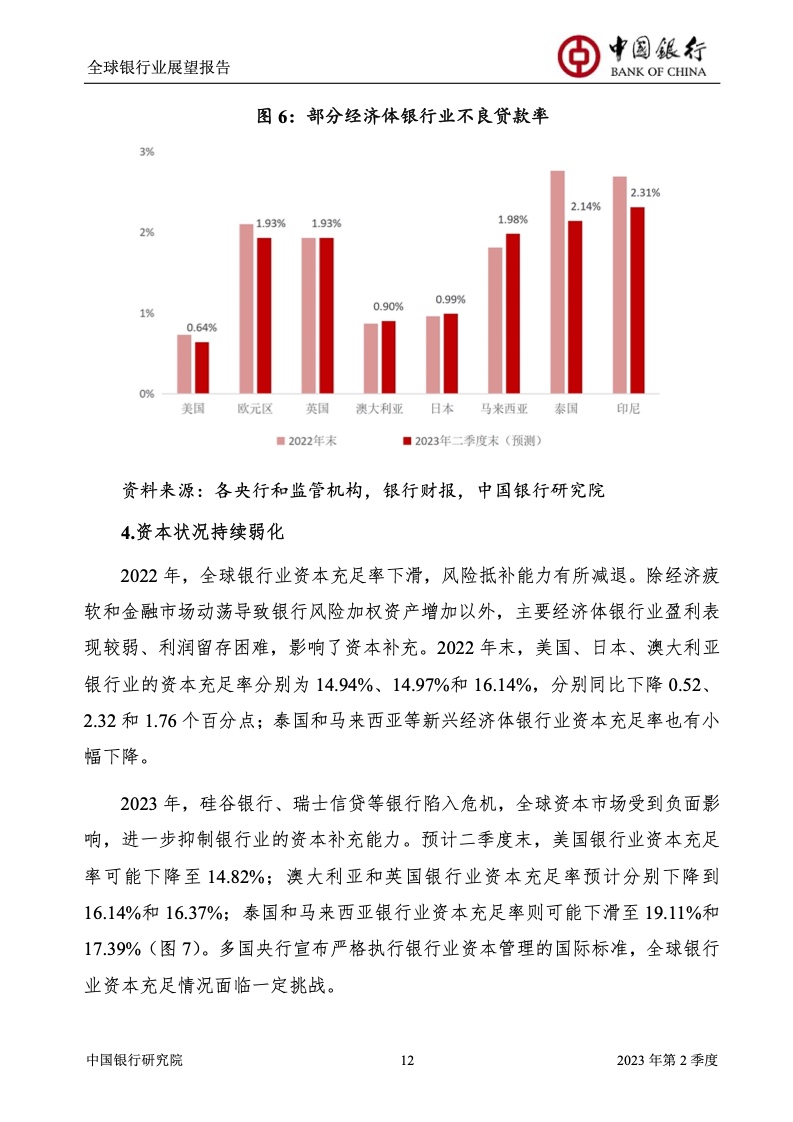 中国银行研究院:2023年第2季度全球银行业展望报告 关于全球银行业发展形势,《报告》认为,2023年以来,全球经济面临众多挑战,主要经济体持续大幅加息导致金融体系动荡,银行业经营压力加大,资产规模有所收缩,一定程度上影响盈利增长,资本补充持续受阻。 相对而言,中国银行业经营环境总体向好,经济复苏动能逐渐增强,财政货币政策组合发力,金融监管聚焦抓改革、补短板、促发展、惠民生、防风险,金融行业整体稳健发展,形成良好竞合生态。 在此背景下,中国银行业经营持续向好,规模保持较高增速,盈利水平企稳回升,资产质量和资本充足情况良好。 更多阅读:中国银行研究院:2025年第二季度全球银行业展望报告中国银行研究院:2025年第三季度全球银行业展望报告中国银行:全球银行业展望报告(2025年)中国银行:2022年第3季度全球银行业展望报告中国银行研究院:2020年中国银行全球经济金融展望报告中国银行研究院:2024年第三季度全球银行业展望报告中国银行研究院:2024年第三季度全球经济金融展望报告中国银行研究院:2025年第三季度全球经济金融展望报告中国银行研究院:2025年第2季度全球经济金融展望报告中国银行研究院:2023年第2季度中国经济金融展望报告中国银行研究院:2022年第3季度中国经济金融展望报告中国银行研究院:2024年第2期中国区域经济金融展望报告中国银行研究院:2025年第三季度中国经济金融展望报告中国银行研究院:2025年第二季度中国经济金融展望报告中国银行研究院:2024年第3季度中国经济金融展望报告