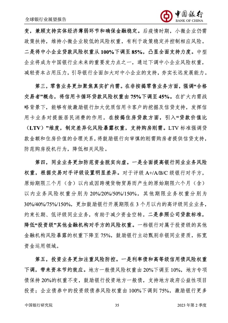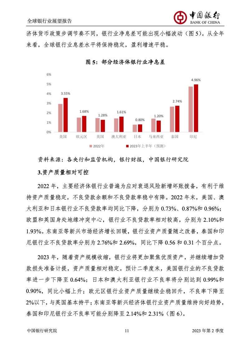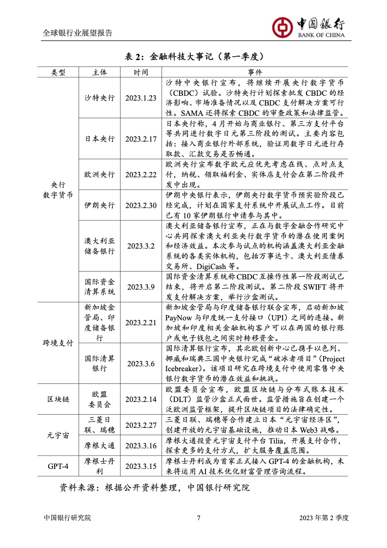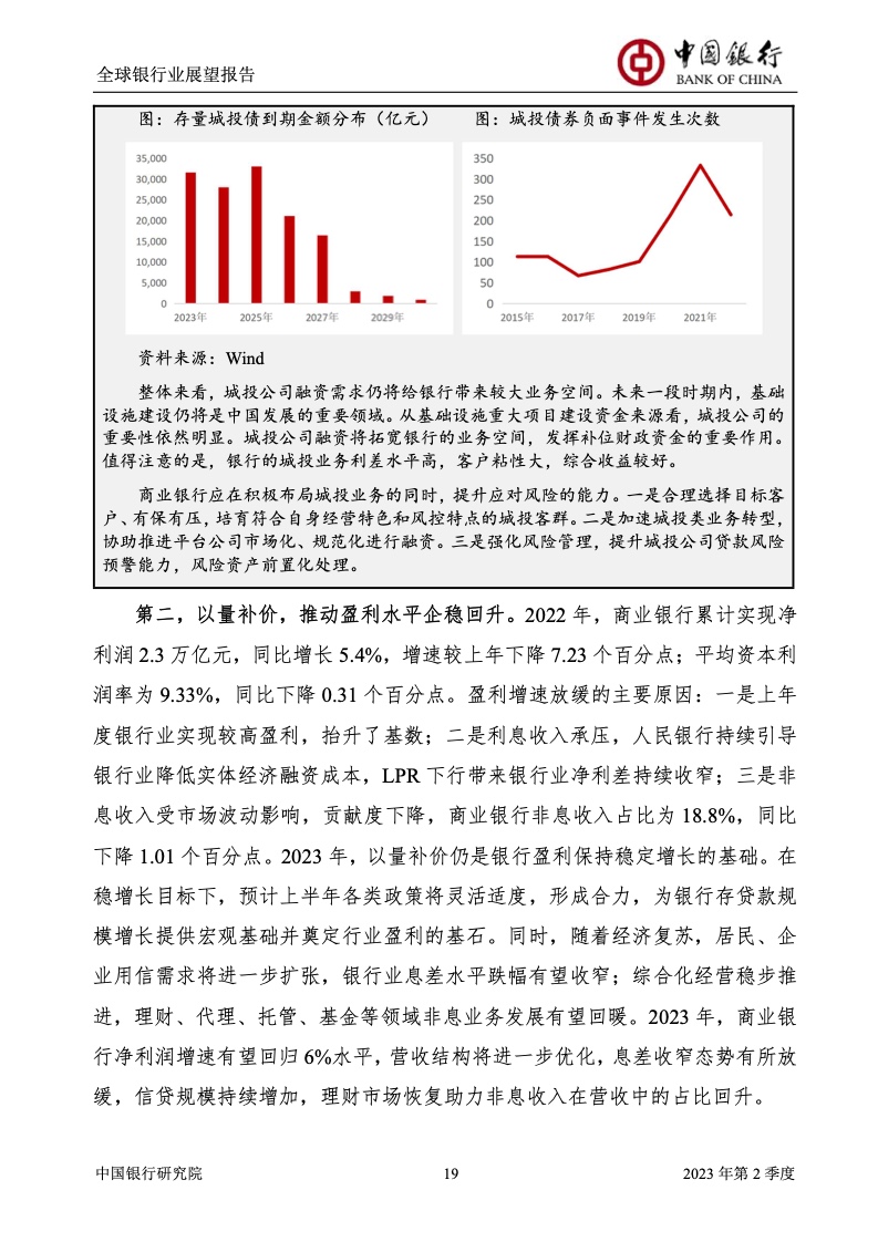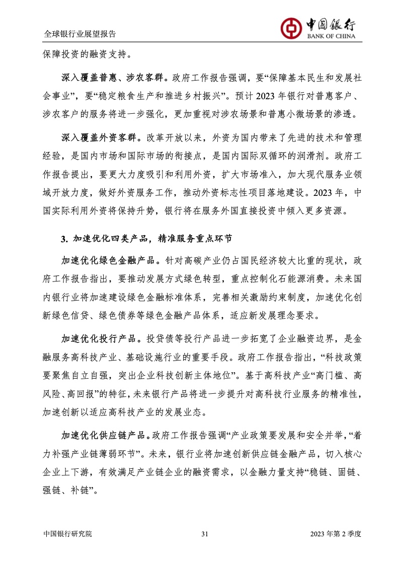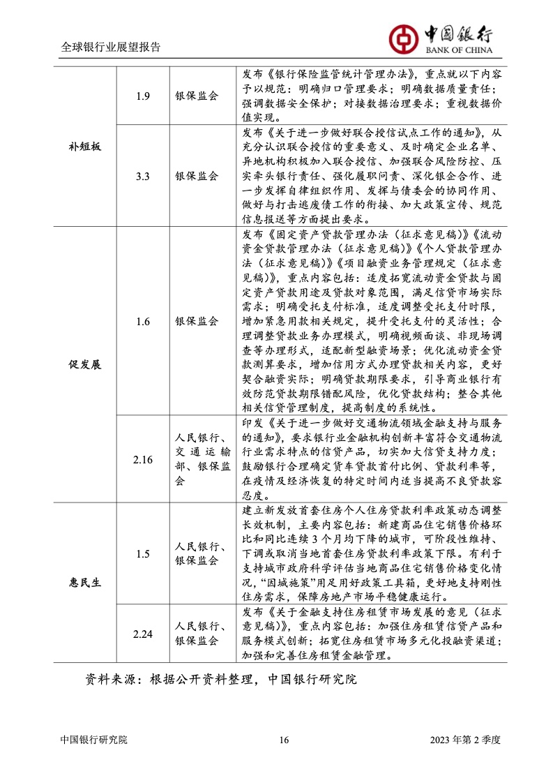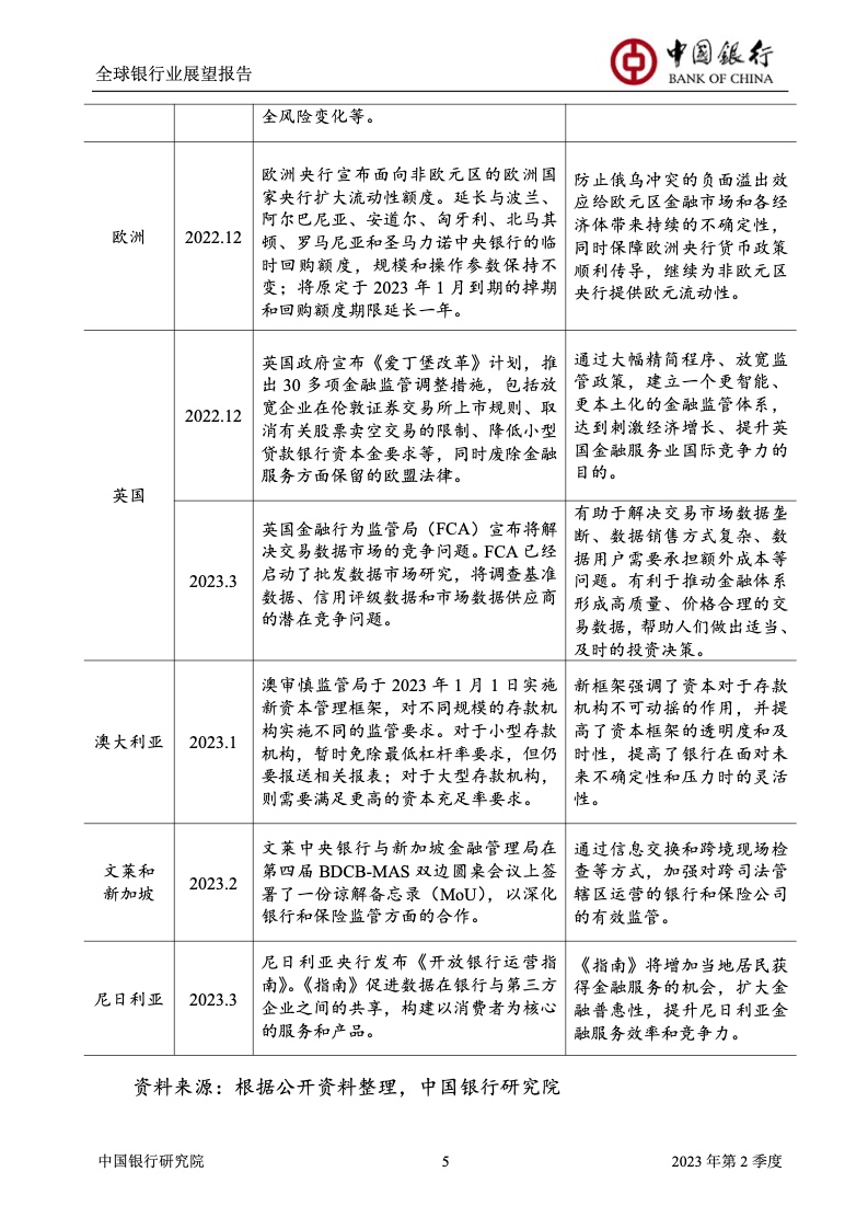 中国银行研究院:2023年第2季度全球银行业展望报告 关于全球银行业发展形势,《报告》认为,2023年以来,全球经济面临众多挑战,主要经济体持续大幅加息导致金融体系动荡,银行业经营压力加大,资产规模有所收缩,一定程度上影响盈利增长,资本补充持续受阻。 相对而言,中国银行业经营环境总体向好,经济复苏动能逐渐增强,财政货币政策组合发力,金融监管聚焦抓改革、补短板、促发展、惠民生、防风险,金融行业整体稳健发展,形成良好竞合生态。 在此背景下,中国银行业经营持续向好,规模保持较高增速,盈利水平企稳回升,资产质量和资本充足情况良好。 更多阅读:中国银行研究院:2025年第二季度全球银行业展望报告中国银行研究院:2025年第三季度全球银行业展望报告中国银行:全球银行业展望报告(2025年)中国银行:2022年第3季度全球银行业展望报告中国银行研究院:2020年中国银行全球经济金融展望报告中国银行研究院:2024年第三季度全球银行业展望报告中国银行研究院:2024年第三季度全球经济金融展望报告中国银行研究院:2025年第三季度全球经济金融展望报告中国银行研究院:2025年第2季度全球经济金融展望报告中国银行研究院:2023年第2季度中国经济金融展望报告中国银行研究院:2022年第3季度中国经济金融展望报告中国银行研究院:2024年第2期中国区域经济金融展望报告中国银行研究院:2025年第三季度中国经济金融展望报告中国银行研究院:2025年第二季度中国经济金融展望报告中国银行研究院:2024年第3季度中国经济金融展望报告