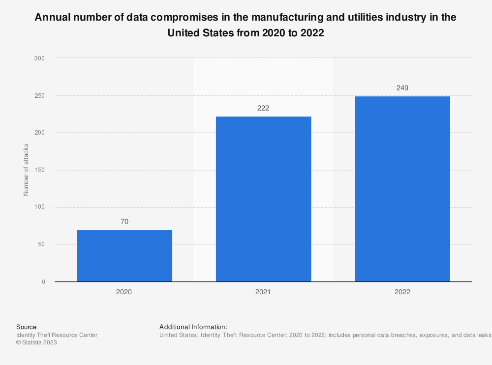 多年来,制造业一直是全球网络犯罪分子最容易攻击的行业之一。仅在美国,2022年就发生了约250起数据泄露事件,在此期间影响了约2390万美国用户。如果成功,攻击者就会为窃取的数据点索要金钱(通常是加密货币),或在暗网上出售数据。2022 年,全球工业数据泄露的平均成本约为447万美元。