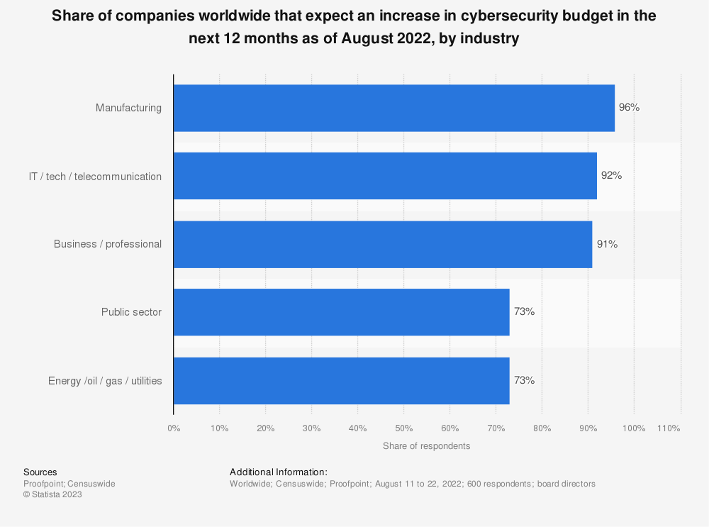 截至2022年8月,全球预计在未来12个月内增加网络安全预算的公司份额,按行业划分。数据来源:Statista.com