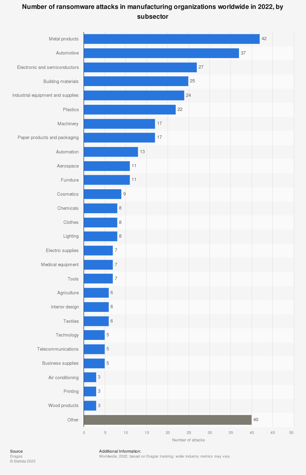 2022年全球制造业机构遭受勒索软件攻击的数量,按子行业划分。 数据来源:Statista.com