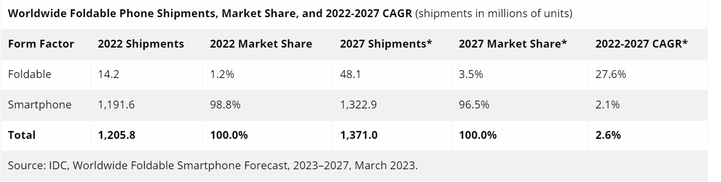 IDC预计,到2023年全球可折叠手机(包括翻盖和折叠)出货量将达到2140万部。这比2022年的1420万台出货量增长了50%以上。IDC最新预测显示,2027年折叠式手机出货量将达到4810万部,从2022年到2027年的复合年增长率(CAGR)为27.6%。