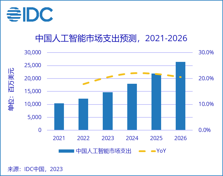 IDC于近日发布了《2023年V1全球人工智能支出指南》(IDC Worldwide Artificial Intelligence Spending Guide)。最新预测数据显示,中国人工智能(AI)市场支出规模将在2023年增至147.5亿美元,约占全球总规模十分之一。受疫情、地缘政治及宏观经济等因素的影响,IDC小幅下调了2022年中国AI市场规模,相比2021年增长约为17.9%。长远来看,AI技术的创新迭代驱动了应用场景的进一步落地,以AIGC、数字人、多模态、AI大模型、智能决策为代表的热点为市场带来了更多想象力和可能性。同时,企业对自身“数字化”、“数智化”转型的积极推动催生出对AI技术的多元化需求,为中国AI市场规模的长期增长奠定了基础。IDC预计,2026年中国AI市场将实现264.4亿美元市场规模,2021-2026五年复合增长率(CAGR)将超20%。