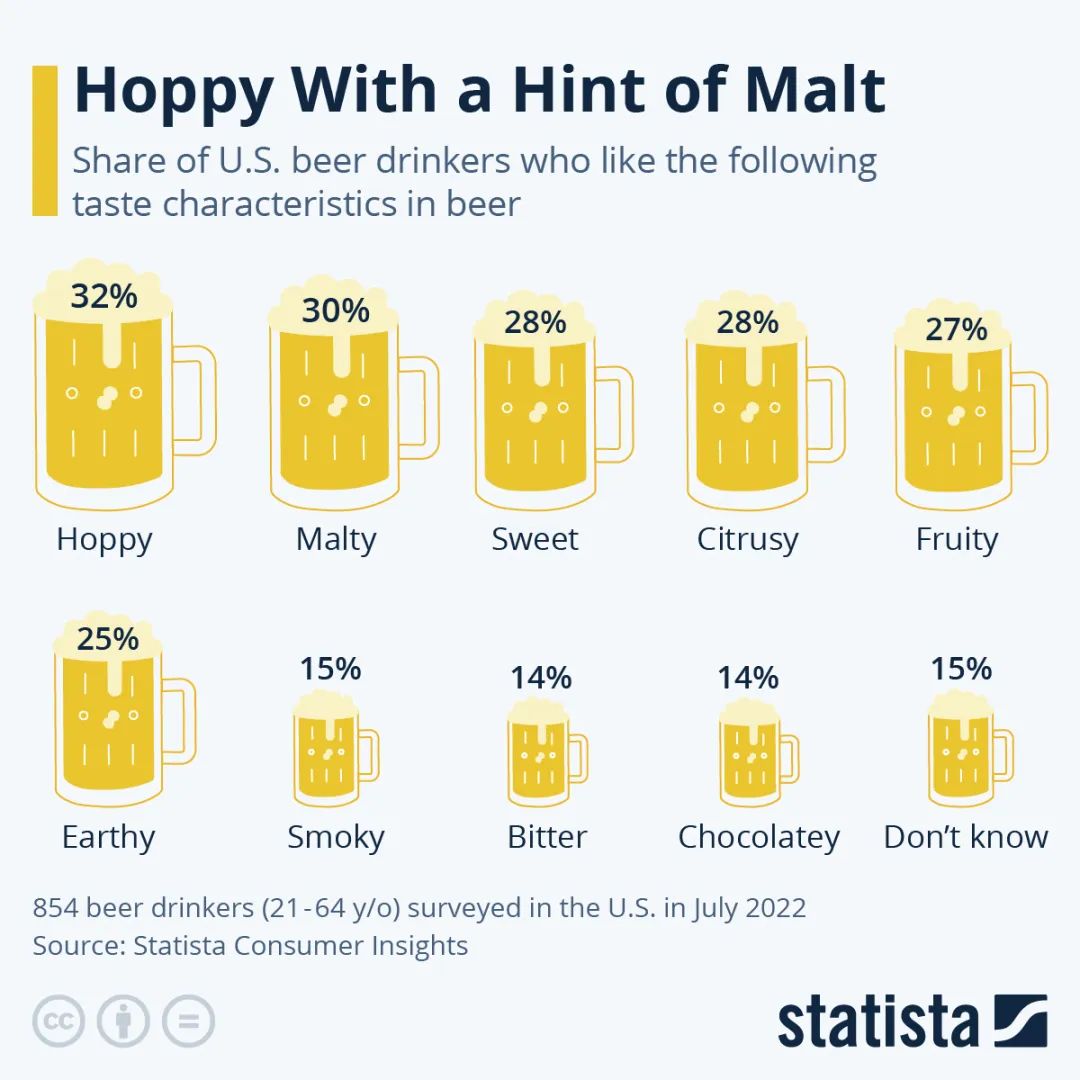 当Statista做消费者洞察数据采集时,询问美国854名啤酒饮用者他们最喜欢的啤酒口味特征时,啤酒花的(hoppy)和麦芽的(malty)是最受欢迎的选择。啤酒花是啤酒中最突出的味道之一,根据啤酒花的种类,它可以给啤酒带来苦味、花香或柑橘味。“啤酒花”啤酒通常被描述为大胆、有力或清爽,而那些寻找“麦芽味”啤酒的人则追求黑啤酒中常见的更柔和、顺滑的味道。麦芽为啤酒提供了丰富的甜味,从焦糖到太妃糖都有。
