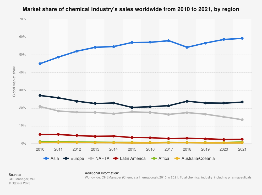 化学工业是全球经济的一个重要组成部分。它将原材料转化为对现代生活至关重要的各种产品,每年在全球产生近4万亿美元的收入。就收入而言,欧洲的化学工业仅次于亚洲。由于新兴市场的竞争加剧和该地区的能源成本上升,欧洲在过去十年里的比例有所下降。但在2020年,欧洲在全球化学品销售中占23%的份额。