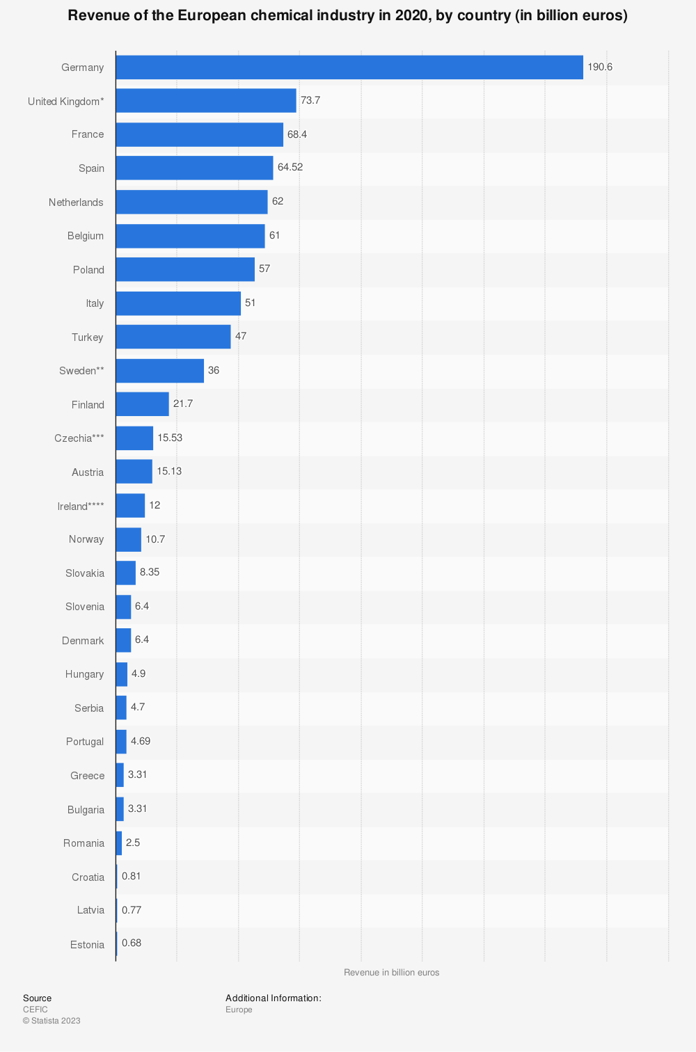2020年欧洲化学工业的收入,按国家划分(单位:十亿欧元) 数据来源:Statista.com