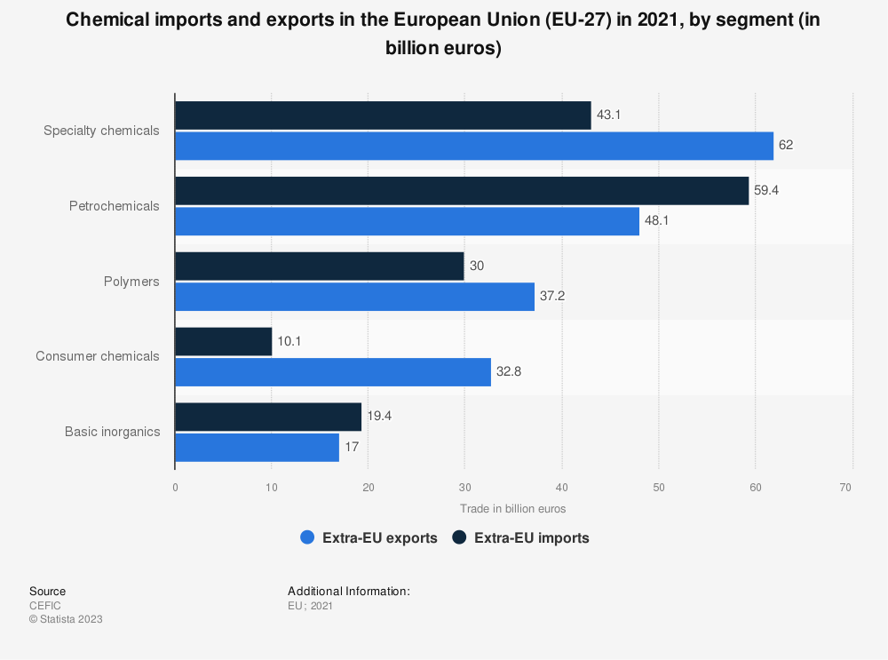 在2021年,专用化学品是出口额最高的产品,约为620亿欧元。与此同时,欧盟化学品进口的最大贡献者是石化产品,超过590亿欧元。