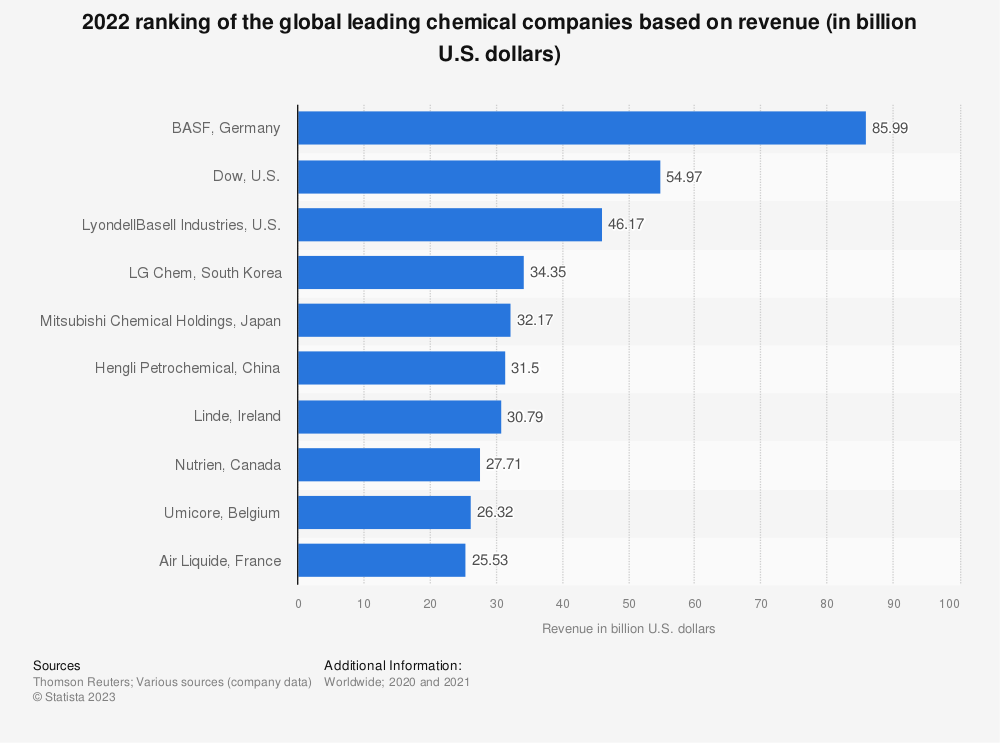 欧洲是一些全球领先的化工公司所在地。总部位于德国路德维希港的巴斯夫(BASF),是全球销售额最大的化工公司。在2021年,这家德国公司的收入超过7800万欧元,拥有超过11.1万名员工。其他总部设在欧洲的主要化工公司包括利安德巴塞尔工业公司(LyondellBasell Industries)、林德(Linde)、优美科(Umicore)和液化空气公司(Air Liquide)。总部位于爱尔兰都柏林的林德专门生产工业气体,按市值计算是全球领先的化学公司。