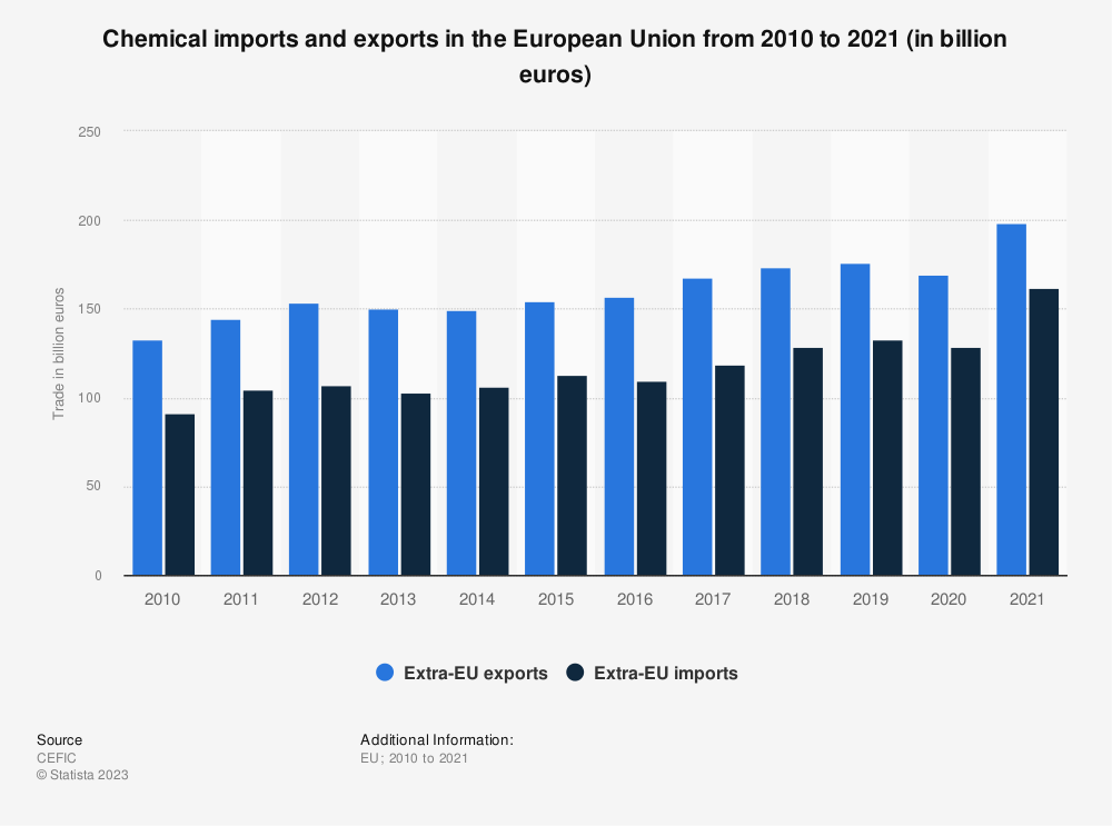 2010年至2021年欧盟的化学品进出口情况(单位:十亿欧元) 数据来源:Statista.com