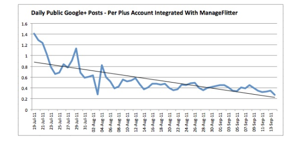 2011年9月15日据美国89n.com网站的统计结果显示,Google+每日的发帖数量已开始下滑。2011年7月19日至8月19日期间,每用户每日平均在Google+上发表0.68个公开贴(public post),而在2011年8月19日之9月14日期间,每用户每日平均在Google+上仅发表0.40个公开贴,降幅为41%。
