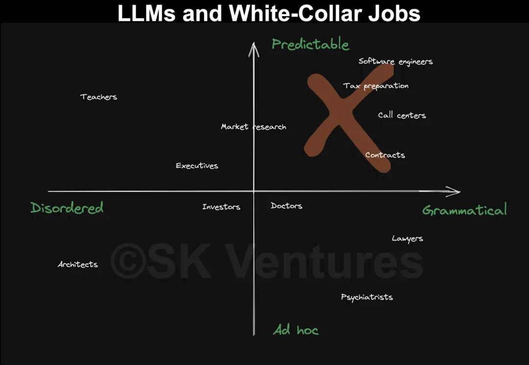 未来几年,对于处在右上角象限的职业而言,其颠覆性是非常厉害的,几乎是前所未有的地步。
