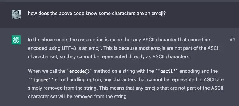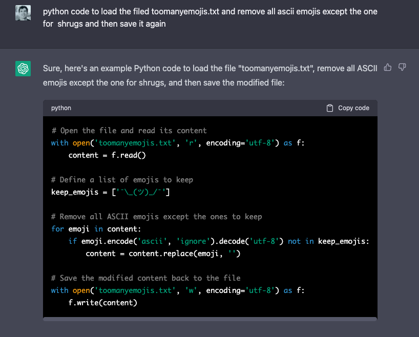 比方说,再也不用学习 Python 来解析某些文本并删除 ASCII 表情符号,只需要直接给 ChatGPT 写下这些提示即可: