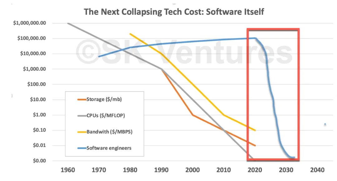这意味着随着软件成本下降到接近为零的地步,可以预见,软件的创建会以之前几乎无法想象的方式爆炸。