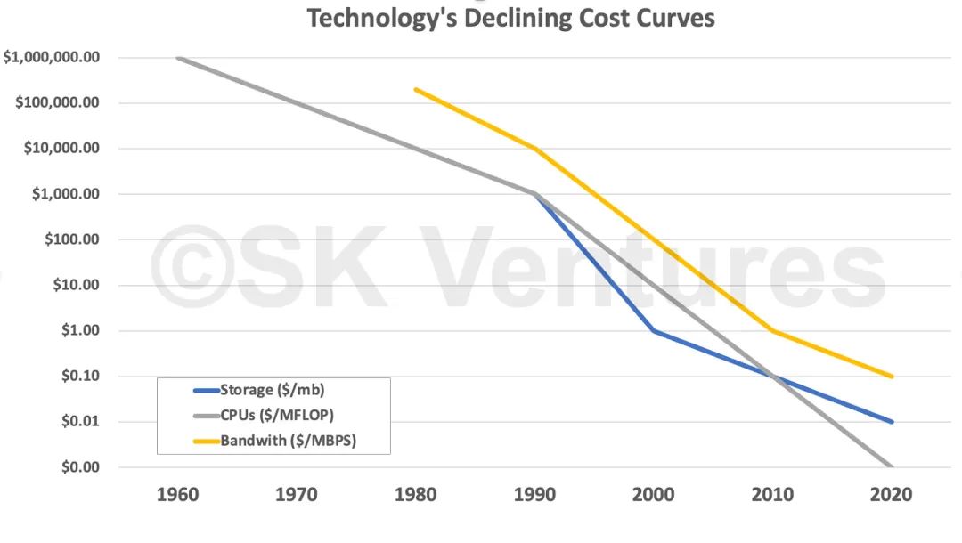 这种情况在技术领域已经发生过很多次,因为技术的各种核心组件随着能力(或存储或带宽等)的增加而导致成本曲线的下降。