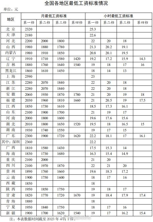 其次是深圳,月最低工资标准达到2360元。北京排第三,月最低工资标准达到2320元。从小时最低工资标准来看,北京小时最低工资标准为25.3元,为全国最高。