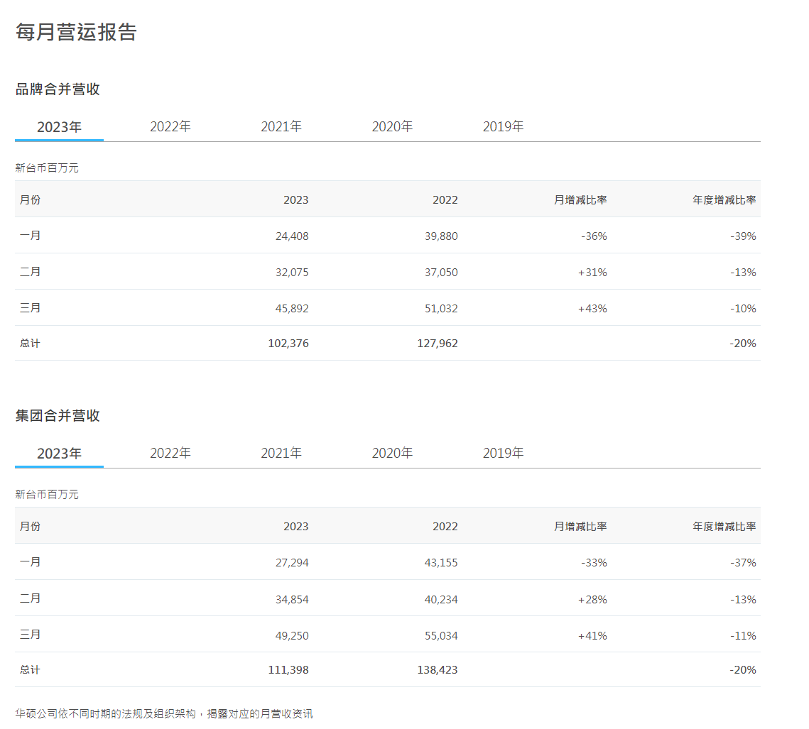 PC 品牌大厂华硕今日公布了最新营收报告。今年 3 月,该集团营收达新台币 492.50 亿元(I备注:当前约 111.31 亿元人民币),月增 41.3%、但年减 10.51%;今年首季累计营收为新台币 1113.98 亿元,年减 19.52%。华硕表示,今年首季营收表现符合公司预期,月营收亦达成逐月成长的正向发展趋势。