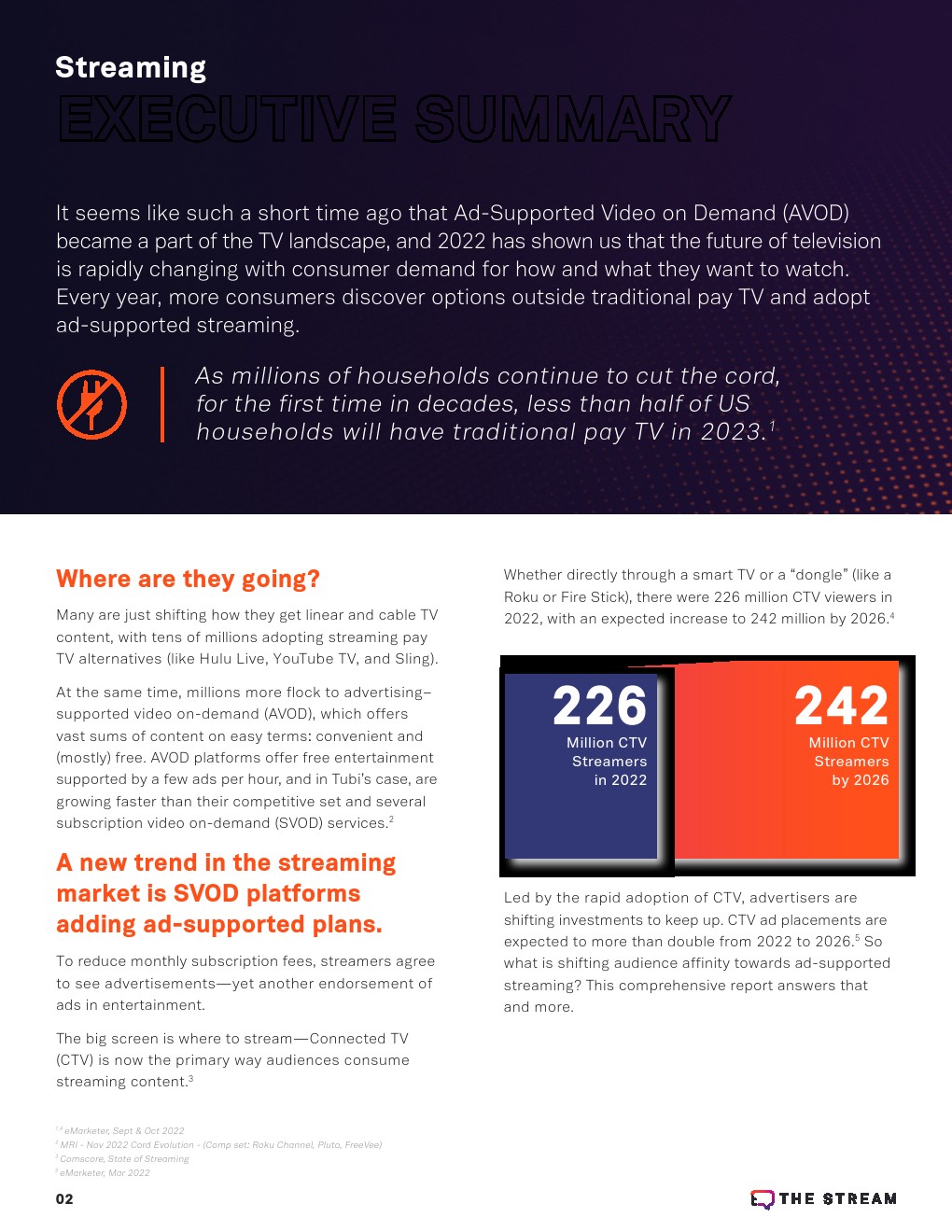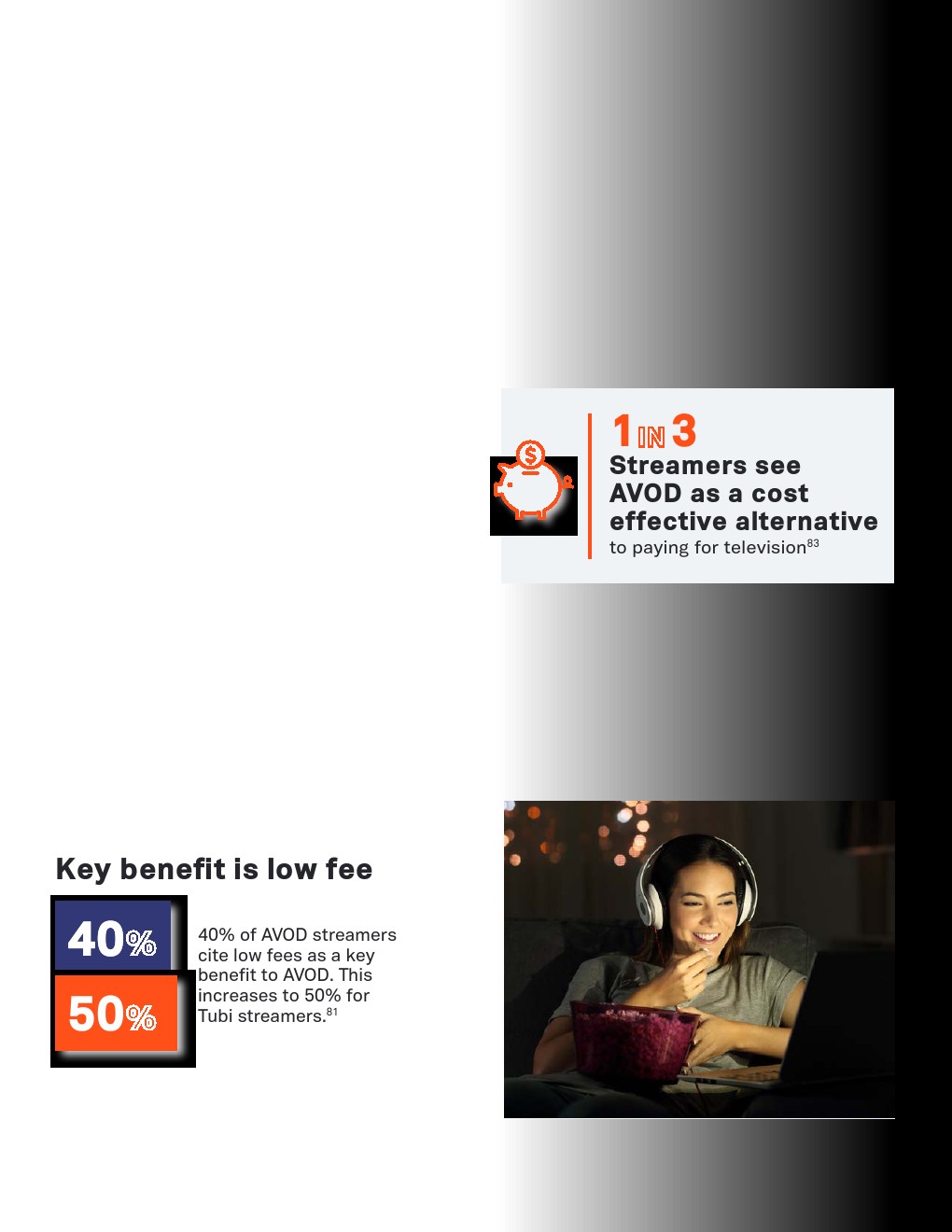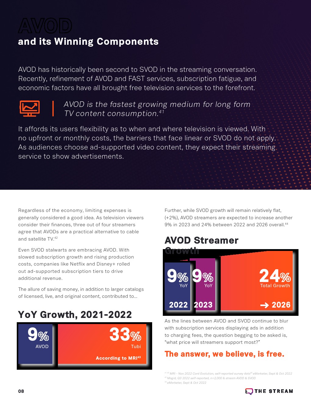 许多人只是在改变他们获取电视内容的方式,数以千万计的人采用流媒体付费电视替代方案,如 Hulu Live、YouTube TV 和 Sling。与此同时,还有数百万人涌向广告支持的视频点播(AVOD),它以简单的方式提供大量内容:方便且(大部分)免费。 AVOD 平台提供每小时几个广告支持的免费娱乐,在 Tubi 的案例中,其增长速度超过其竞争对手和一些订阅视频点播(SVOD) 服务。