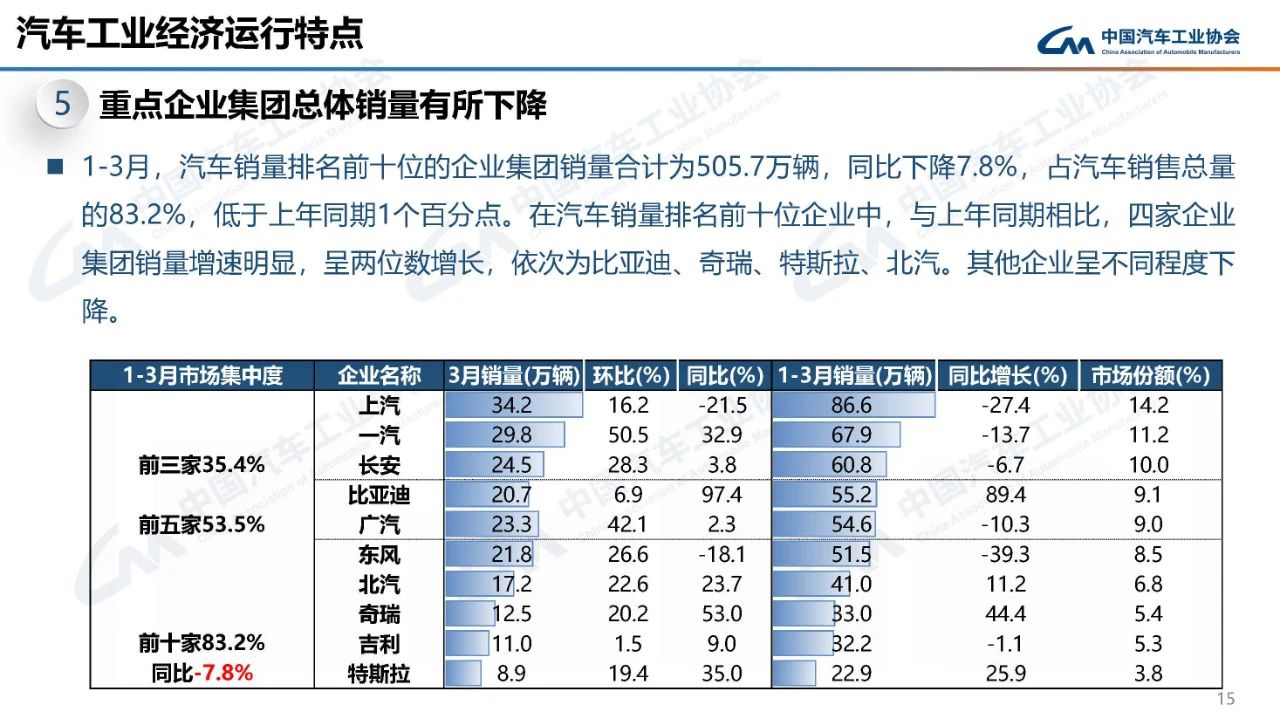 1-3 月,汽车销量排名前十位的企业集团销量合计为 505.7 万辆,同比下降 7.8%,占汽车销售总量的 83.2%,低于上年同期 1 个百分点。在汽车销量排名前十位企业中,与上年同期相比,四家企业集团销量增速明显,呈两位数增长,依次为比亚迪、奇瑞、特斯拉、北汽。其他企业呈不同程度下降。