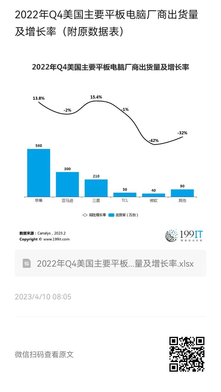 2022年Q4美国主要平板电脑厂商出货量及增长率(附原数据表) ​​​