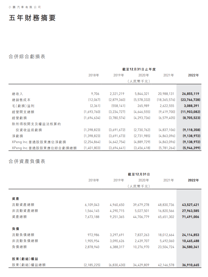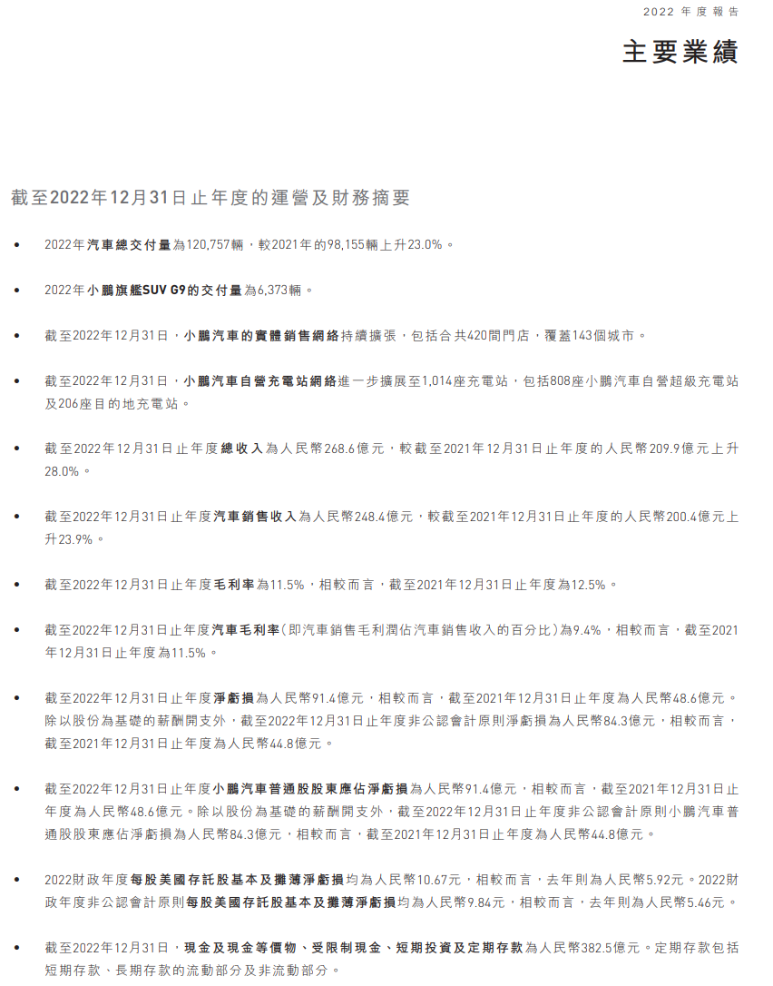小鹏汽车公布了 2022 年度报告。截至 2022 年 12 月 31 日止,小鹏汽车这一年总收入为 268.6 亿元,同比上升 28.0%。截至 2022 年 12 月 31 日止年度汽车销售收入为 248.4 亿元,同比上升 23.9%。截至 2022 年 12 月 31 日止年度净亏损为 91.4 亿元,相较而言,截至 2021 年 12 月 31 日止年度为 48.6 亿元。
