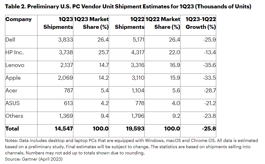 2023 年第一季度全球 PC 市场的顶级厂商保持不变,联想以 23.3% 的市场份额保持出货量第一。