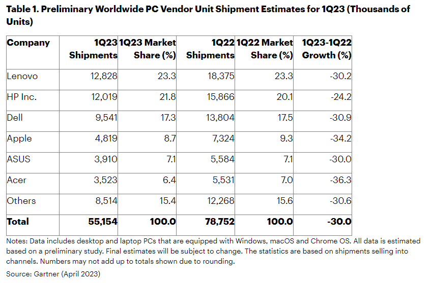 根据市场调查机构 Gartner 公布的最新统计报告,2023 年第 1 季度全球 PC 出货量为 5520 万台,比 2022 年第一季度下降 30%。