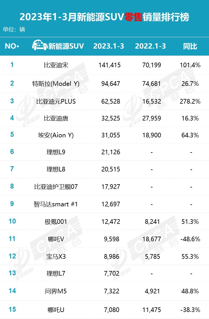今年前三个月,比亚迪宋零售销量达到了 141415 辆,而特斯拉 Model Y 则为 94647 辆,理想 L9 和 L8 都在两万以上,而问界 M5 仅有 7322 辆。