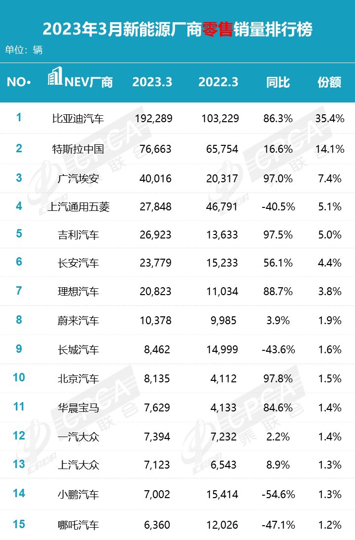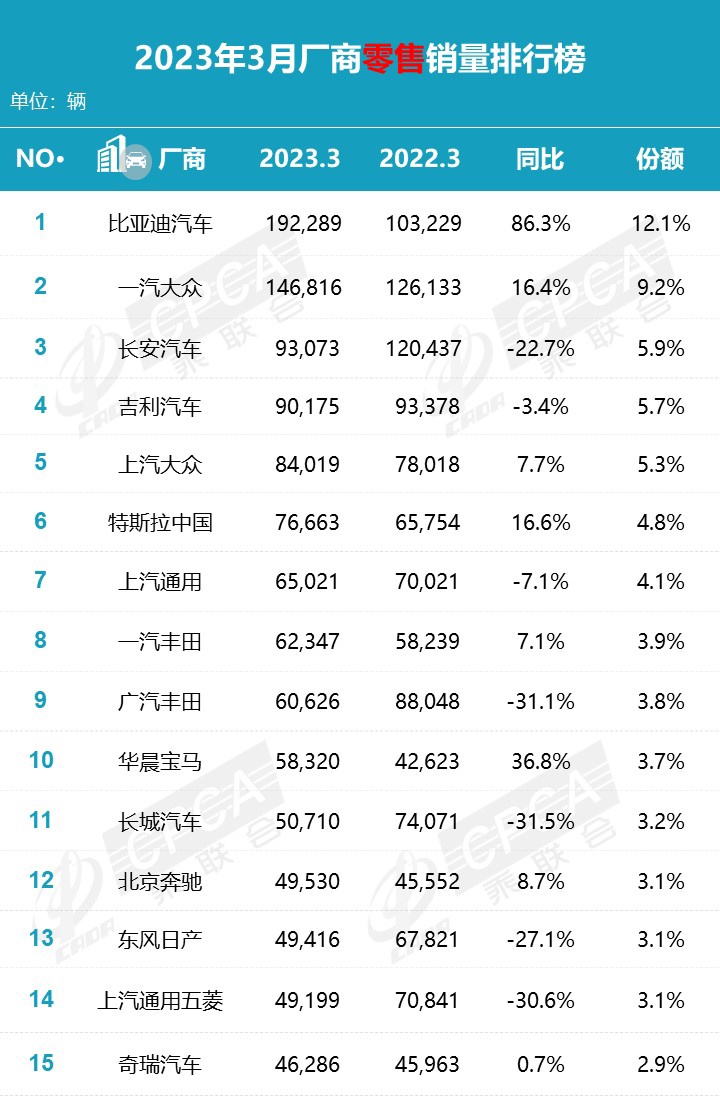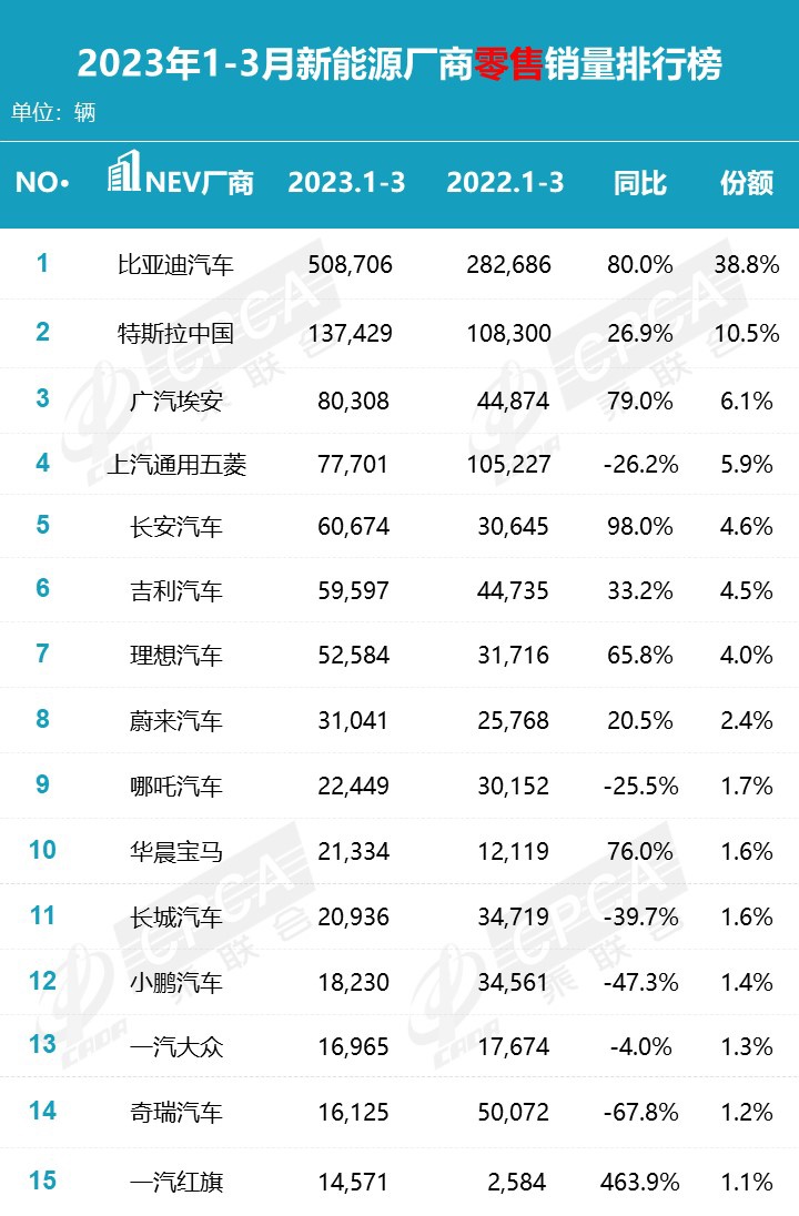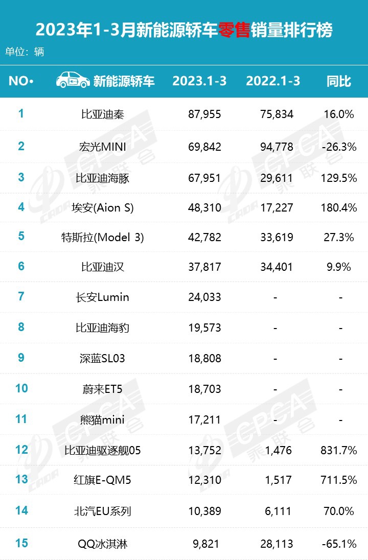 今年前三个月,比亚迪秦零售销量达到了 87955 辆,上汽通用五菱宏光 MINI 为 69842 辆,特斯拉 Model 3 为 42782 辆,深蓝 SL03 达到了 18808 辆。
