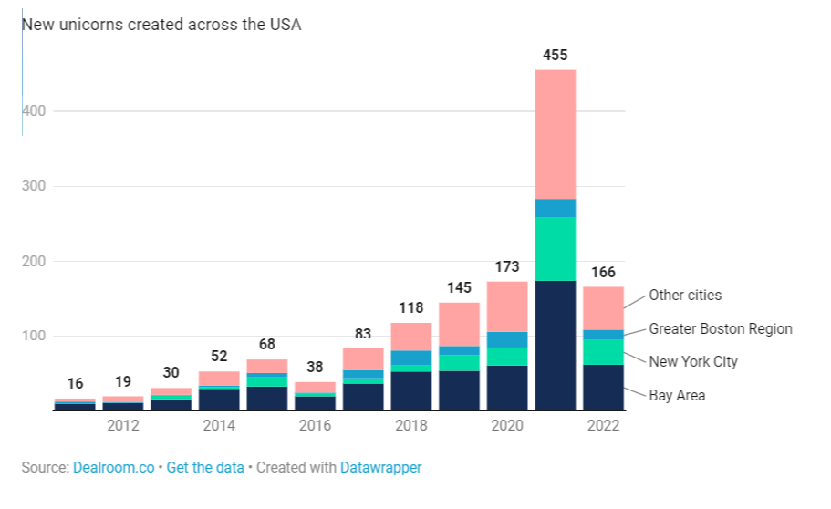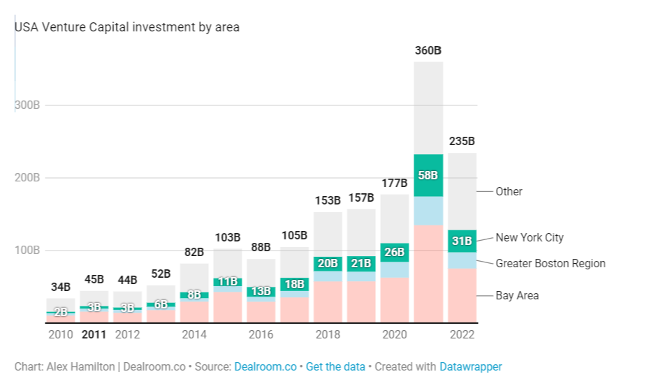 湾区、大波士顿和纽约市等主要大都市地区继续占据风险投资活动的大部分, 2022 年约占总投资的一半。