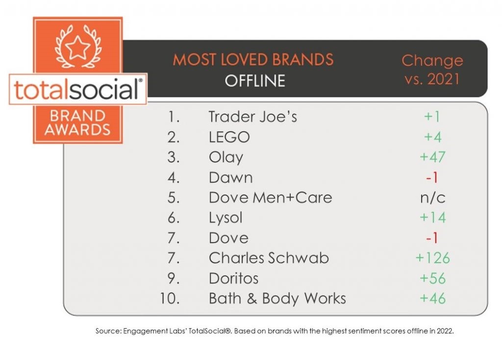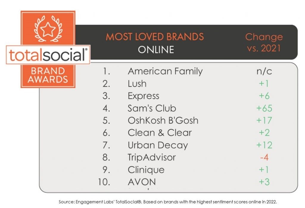根据在线(通过社交媒体)和离线(通过面对面对话以及电话、电子邮件、短信、即时通讯、视频聊天)发生的积极对话对消费者最喜爱的品牌进行排名。