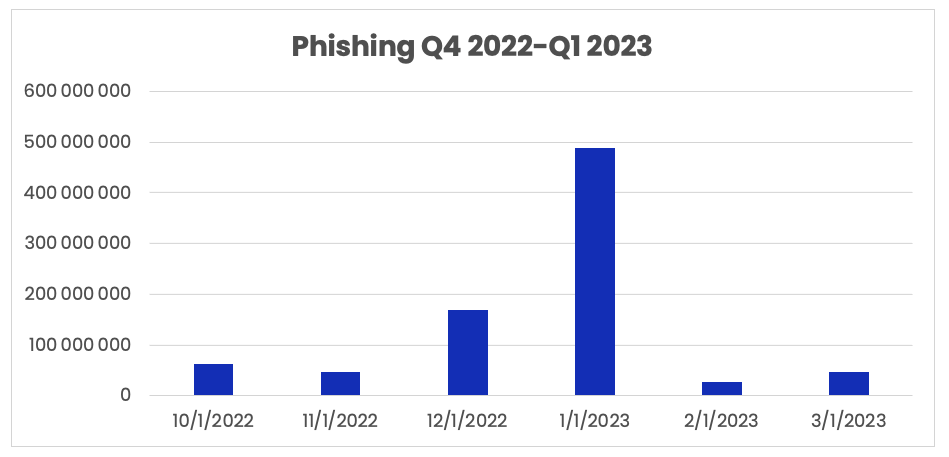 根据电子邮件安全和威胁检测公司 Vade 公布的最新报告,2023 年第 1 季度共检测到 5.624 亿封,比上一季度增加 2.848 亿封,环比增加 102%。