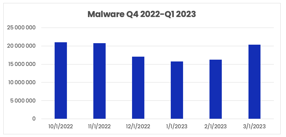 其中今年 1 月是第 1 季度钓鱼电子邮件数量最多,达到了 4.885 亿封。从报告中还获悉,恶意电子邮件数量为 5230 万封,环比下降了 7%,同比下降了 13%。