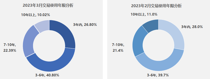 从车龄结构上看3月份较长车龄的占比是有所增加的,3-6年、7-10年的车型比2月份均有所增长。