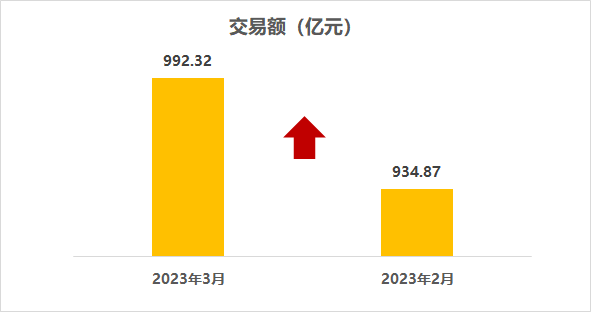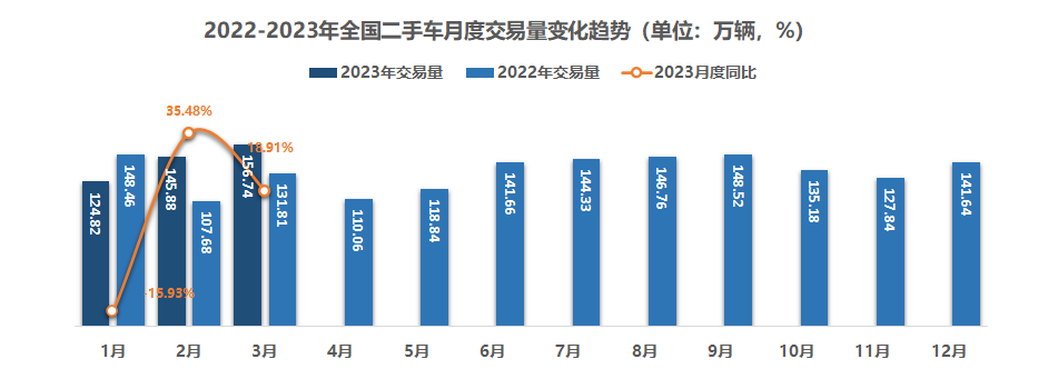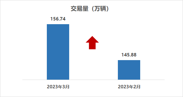 2023年3月,全国二手车市场交易量156.74万辆,交易量环比增长7.4%,同比增长18.9%,交易金额为992.32亿元。